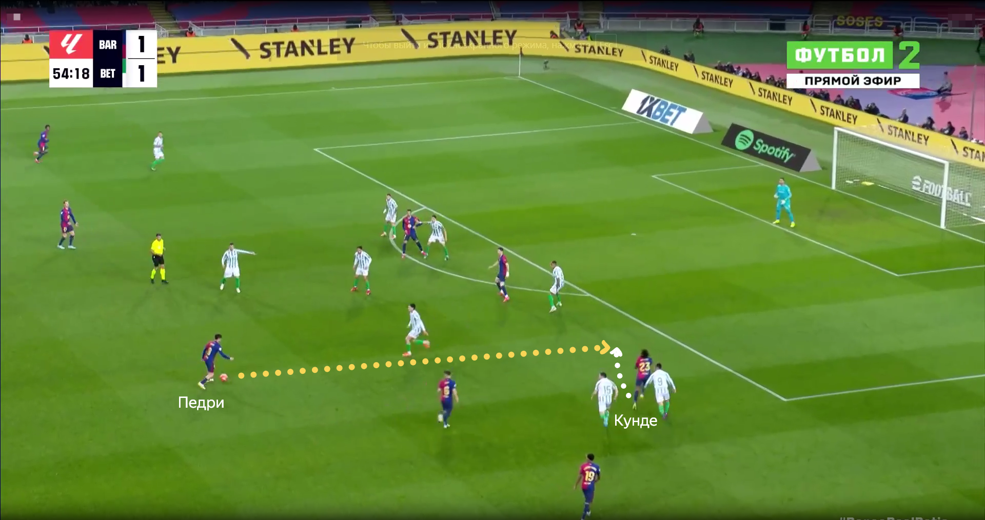 Впереди у «Барселоны» регулярно образовывалась даже шестерка футболистов. Если севильцы пытались перекрыть всех, то в какой-то зоне обязательно образовывалась пустота. Например, здесь Педри и Кунде воспользовались именно такой ситуацией.