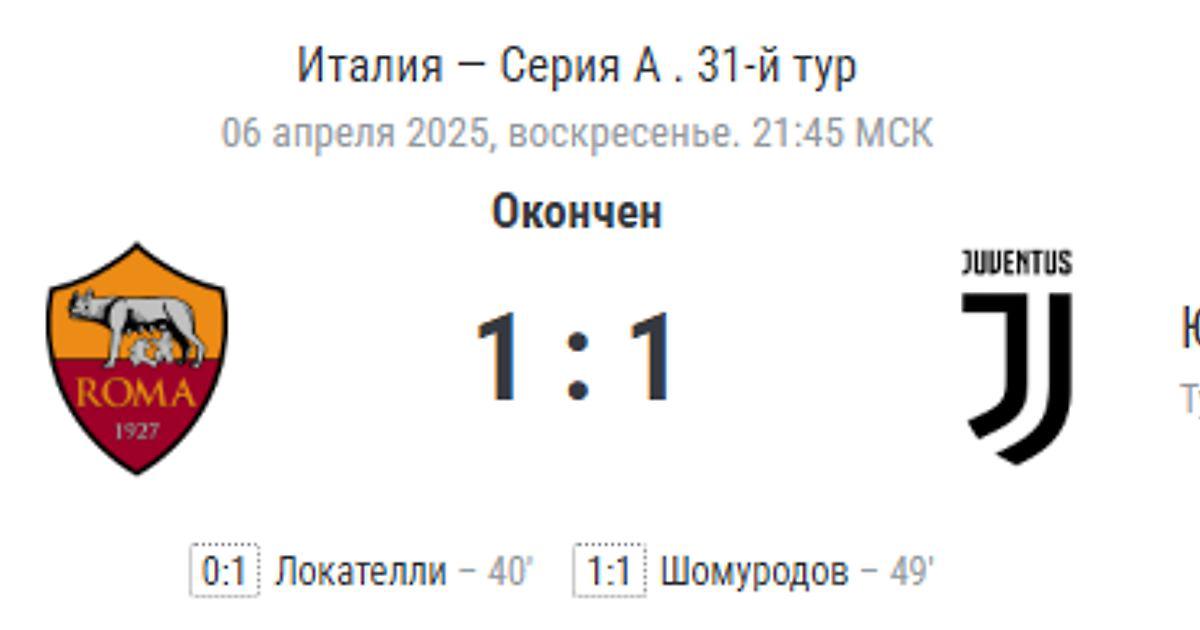 Завершился матч 31-го тура итальянской Серии А, в котором встречались «Рома» и туринский «Ювентус». Команды играли на стадионе «Олимпико» в Риме (Италия). Встречу обслуживала бригада арбитров во главе с Андреа Коломбо. Итоговый результат — 1:1.