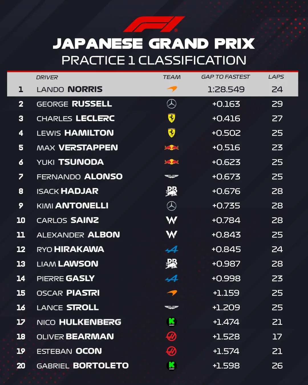 🏎️ На прошлой недели проходил Гран-При Японии и вот результаты первой сессии свободных заездов: