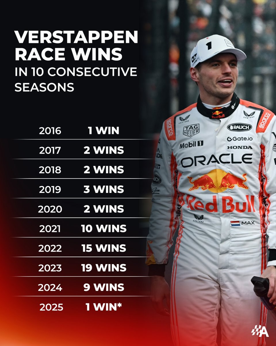 🔝 Макс Ферстаппен побеждает как минимум в одной гонке сезона последние десять лет. Ранее это удавалось лишь Просту, Шумахеру и Хэмилтону.