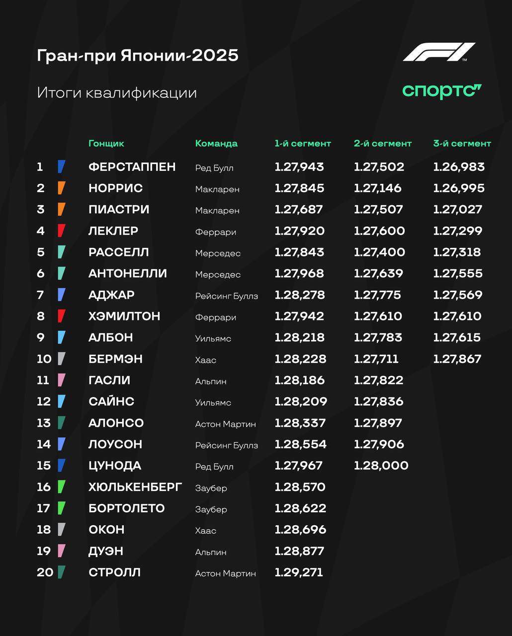 🏎️ Продолжилась суббота с квалификации - квалификацией. Макс Ферстаппен неожиданно занял поул! Вот полные итоги: