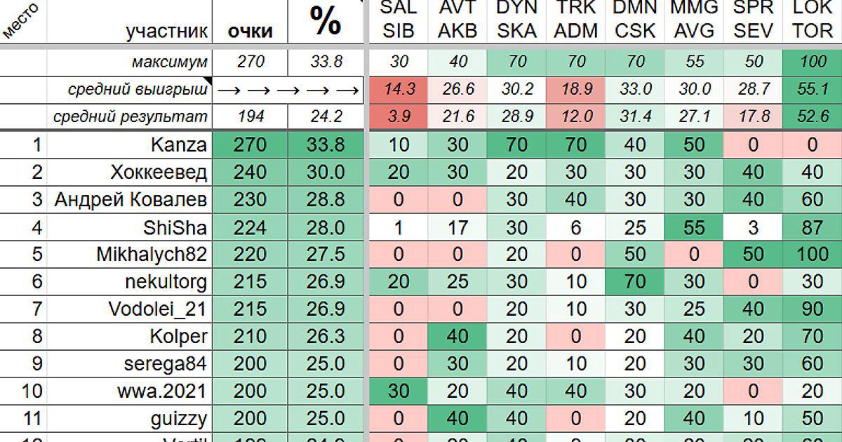 По итогам 8 серий средний выигрыш составляет 24,2 балла, что означает 24% точность прогнозов (у лидера 33,8%). Напомню, что в прошлом розыгрыше Кубка Стэнли победу одержал участник с точностью 30,33%! Возможно, КХЛ окажется более предсказуемой. Давайте узнаем!