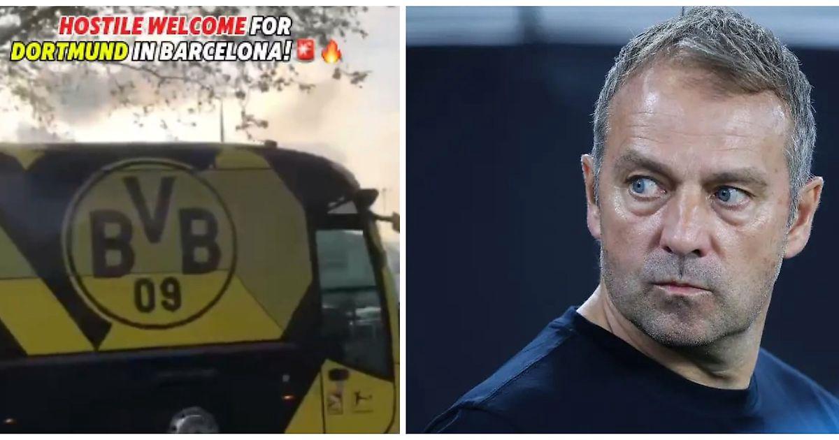 🎥 Фанаты «Барсы» забросали автобус «Боруссии» перед игрой. Летели булыжники и стеклянные бутылки 😡