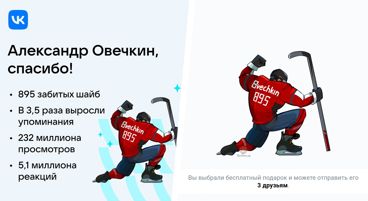 Не остались в стороне от рекорда и другие it-бренды. «ВК» выпустил эмодзи-статусы и виртуальные подарки с хоккеистом. Позже соцсеть сообщила, что статусы установило более 100 тысяч человек, а подарки отправили 265 тысяч раз. При этом количество упоминаний форварда выросло в 3,5 раза, 232 миллиона просмотров собрали новости о достижении, а сам рекорд стал для «ВК» одним из самых популярных спортивных событий за два года.