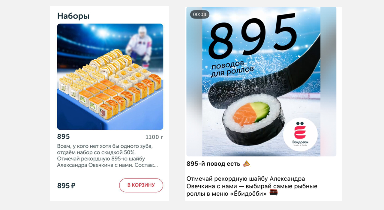 Ещё одна известная сеть доставок, но теперь суши и роллов, выпустила специальный сет в честь Овечкина. А всем клиентам, у которых нет хотя бы одного зуба, обещали скидку 50%. Уникальный шанс сэкономить на зубах, а не потратиться.