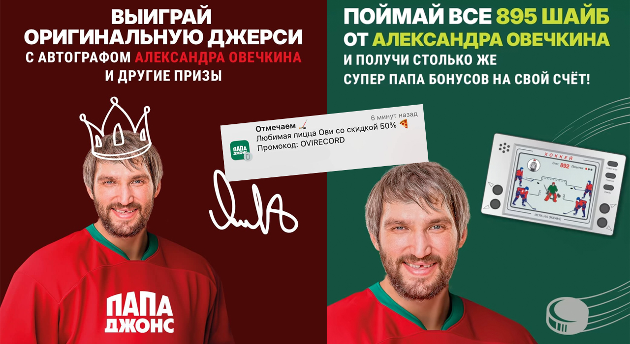 Сеть пиццерий Papa John`s отметилась щедрым дисконтом на 50% при заказе от 1699 рублей. Кстати, в развитие именной этой сети Овечкин инвестировал в 2018 году и неоднократно снимался в рекламе американского Papa John`s.