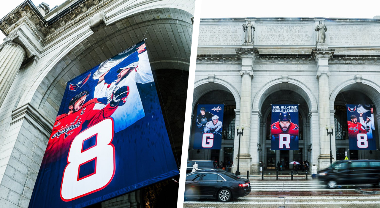 Теперь на связи США. В Вашингтоне не могли обойти стороной такое событие. На Union Station, главном вокзале города, вывесили баннеры G, R и 8 – «Великая восьмёрка». На каждом баннере фото Овечкина.