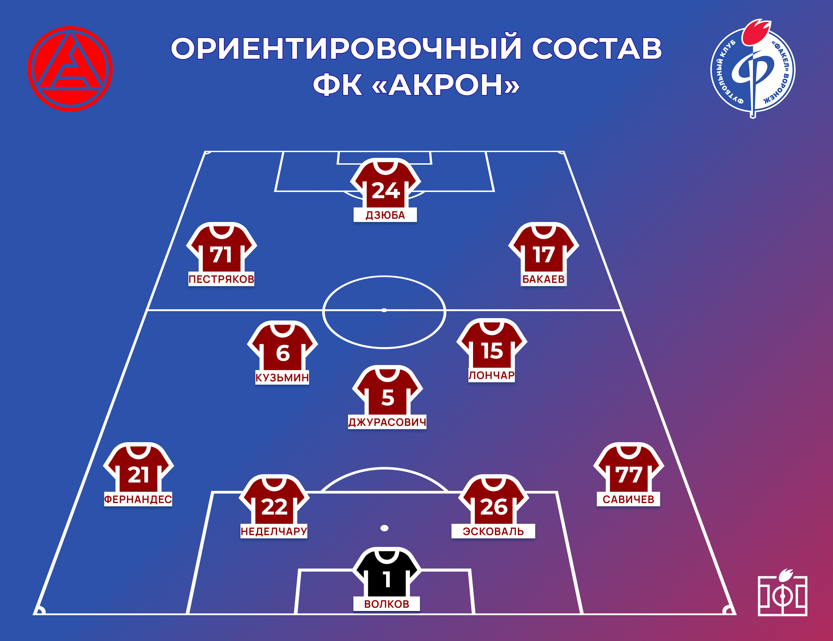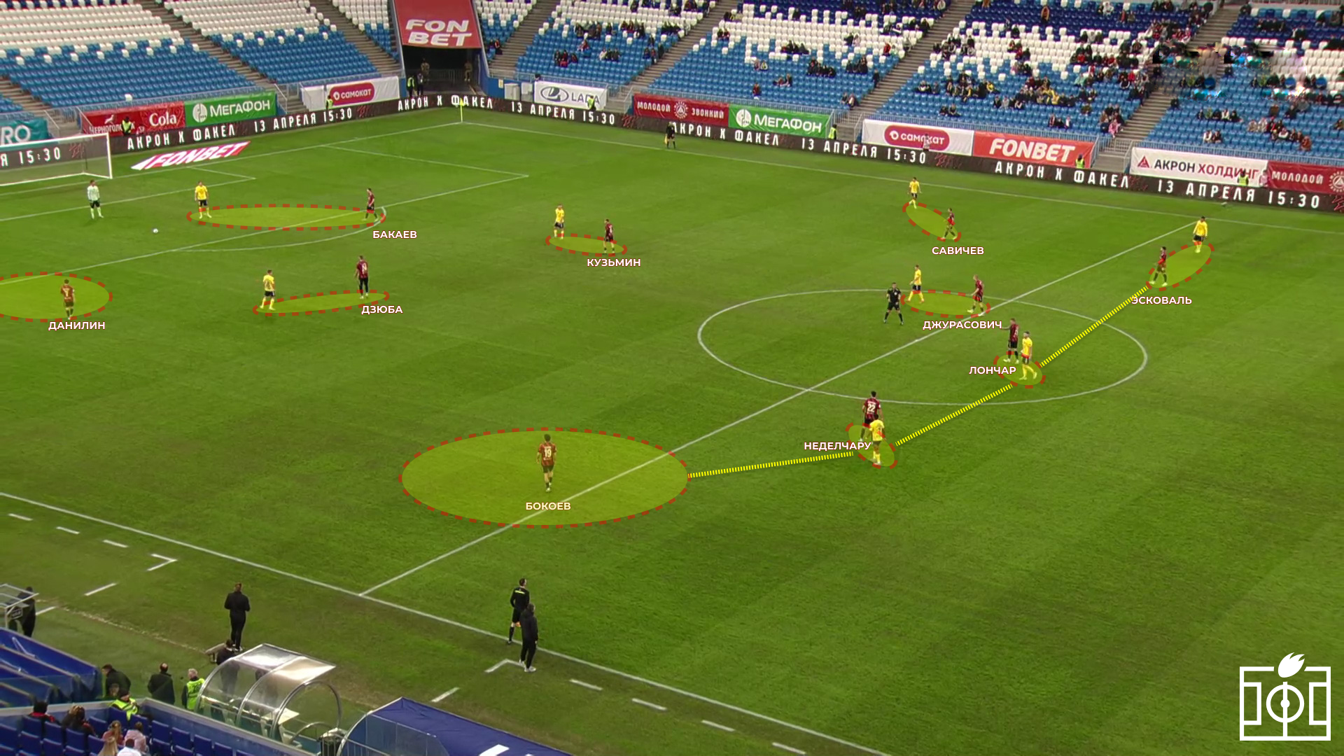 Также игроки «Факела» могут попытаться нейтрализовать развитие позиционных атак «Акрона» через плотную опеку Артёма Дзюбы и персональные ориентировки по центральным полузащитникам соперника в позиционной обороне: