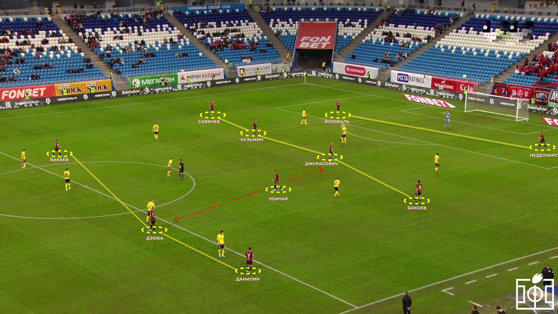 - Учитывая отсутствие в команде номинального игрока на позицию правого крайнего защитника, а также небольшой опыт игры Макса Дзиова справа и его скоростные качества — Дзиов, на мой взгляд, является наиболее подходящим вариантом на эту позицию. Также опыт успешной позиционной игры против Лечи Садулаева в прошлом матче может пригодиться в предстоящей дуэли с Данилиным/Пестряковым. Думаю, в такой формации Дзиов может занимать более сдержанную позицию, фактически становясь третьим центральным защитником при владении мячом.