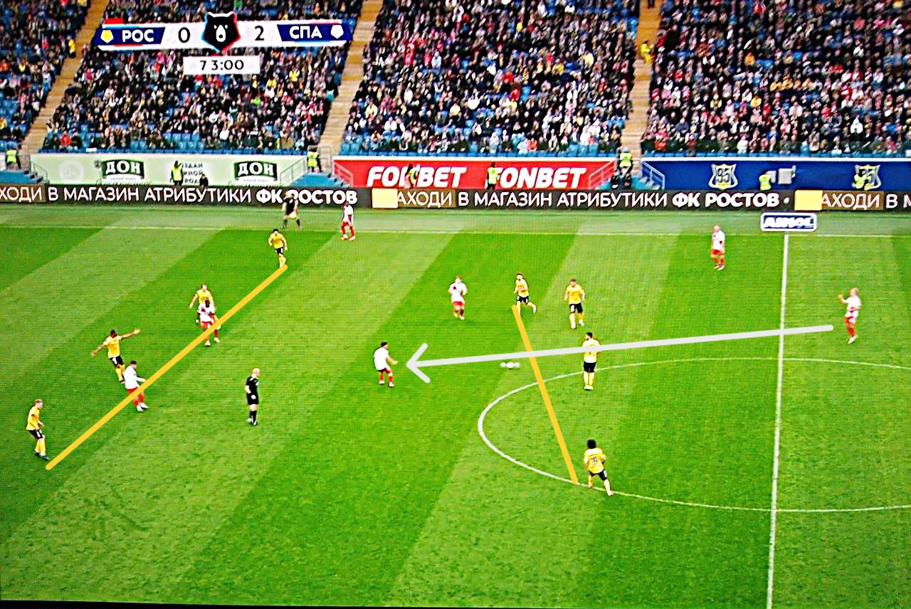 Во втором тайме, имея на игрока больше, красно-белые смяли своих оппонентов, взвинтив темп и усилив давление, что привело к пробоинам в обороне Ростова. Данные действия принесли плоды в виде стандартов, которые приятно удивили, в свою очередь. Из 4 угловых 2 привели к опасным моментам, а один закончился голом Наиля Умярова. Наверняка, на тренировках этим элементам уделили особое внимание, что особенно важно в сложно складывающихся матчах. А уже через несколько минут после подачи Рябчука уже Мартинс разобрался с Осипенко и удвоил преимущество гостей. Дальше довести матч до победы было дело техники, растягивая уставшую оборону соперника и вскрывая её разрезающими передачами (Фото 6). А вишенкой на торте стал сольный проход Барко, который и завершил разгром хозяев.