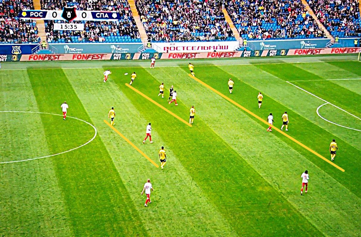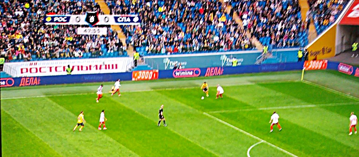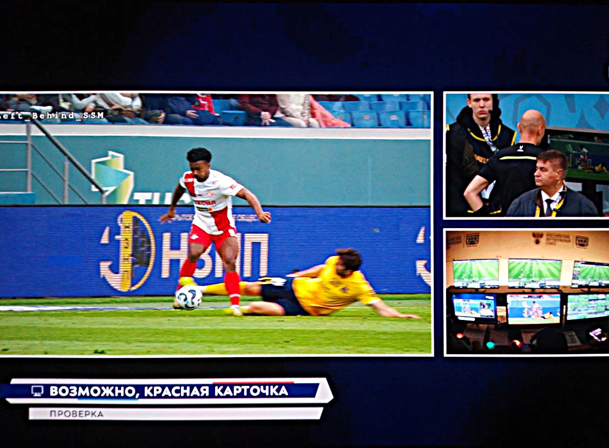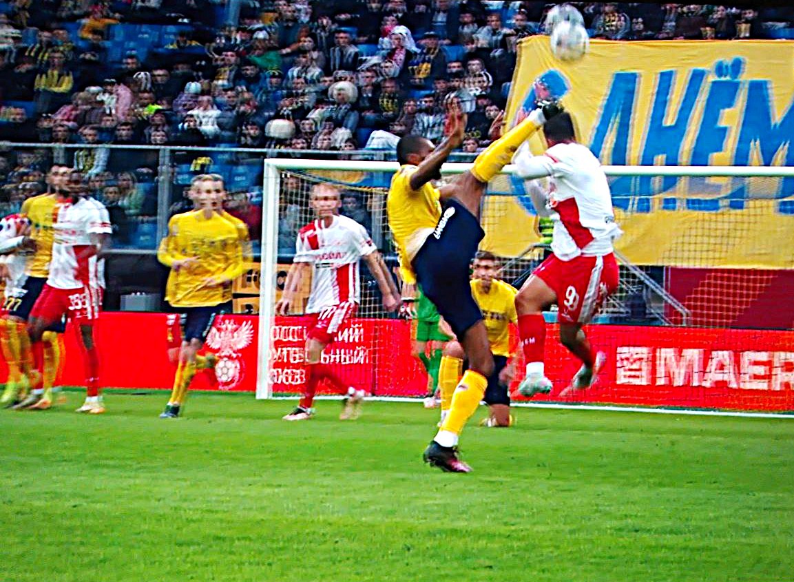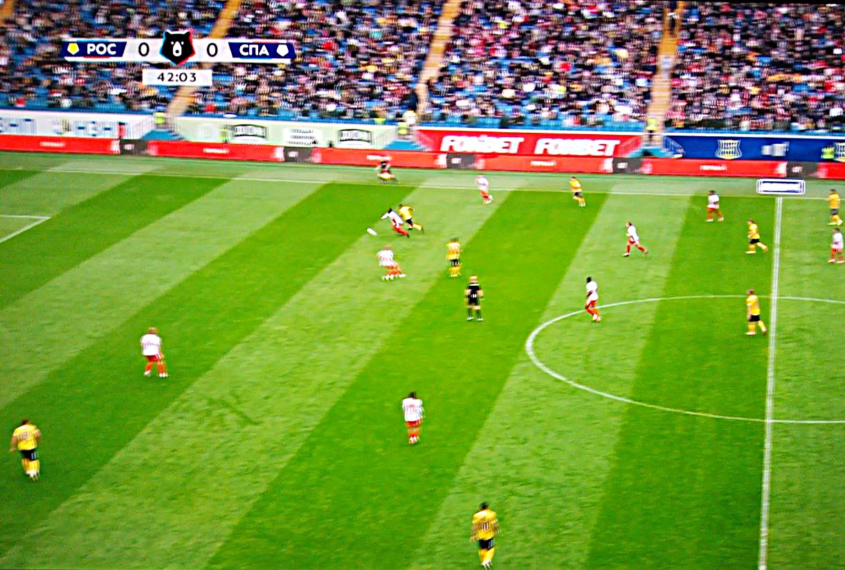 В нападении ростовчане создавали остроту с помощью длинных передач Осипенко на Мохеби, преимущественно через правый фланг, где Денисов и Литвинов раз за разом теряли позиции и упускали оппонентов. Также игроки «Ростова», при случае, симулировали, стараясь снизить темп матча и разбить его на отдельные отрезки, «Спартак», в свою очередь, отвечал за счет быстрых контратак. В конце первого тайма футболисты с берегов Дона перешли на откровенную грубость. Итог: красная карточка Сутормину — совершенно справедливая (Фото 4) и оранжевая карточка у Комличенко (Фото 5).