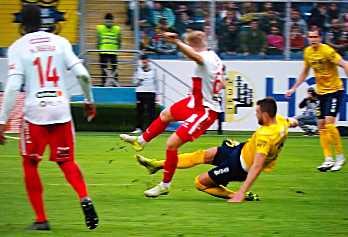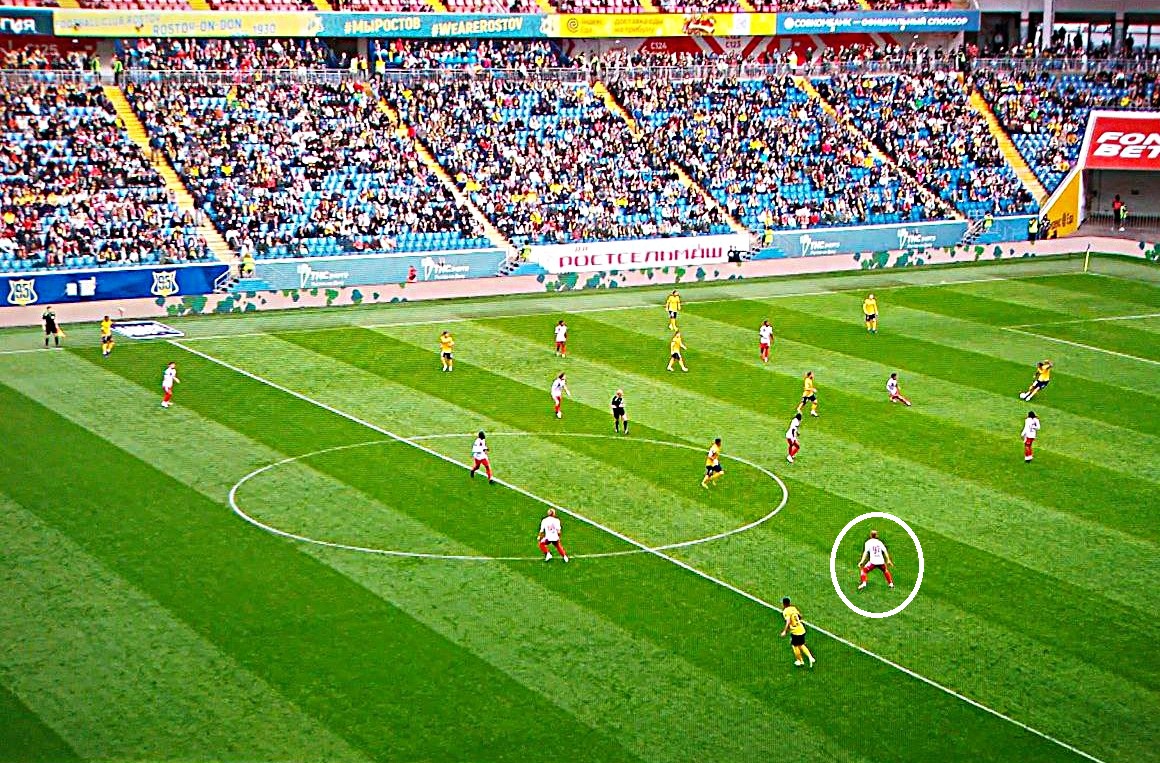 В самом начале матча Руслана накручивают на бровке, и сразу бросается в глаза два его недостатка, а именно: слабая игра в отборе и недостаток скорости. Даниил в этом моменте идёт на подстраховку, но застывает в полу позиции. (Фото 10)