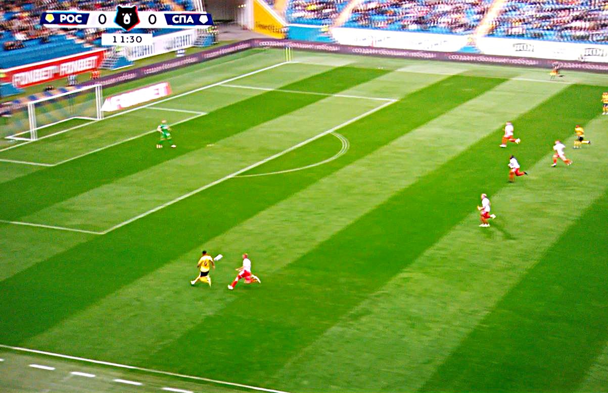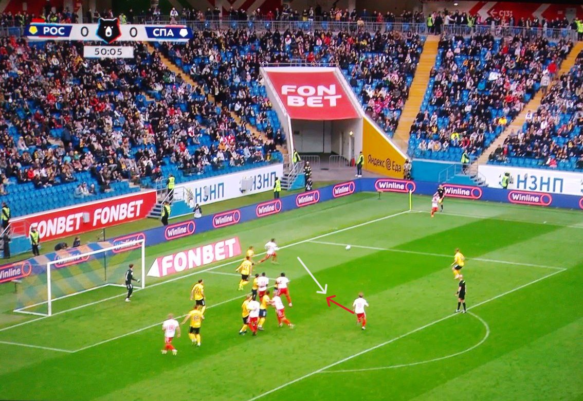 Спартак снова разыгрывает мяч низом, Солари выполняет передачу на дальнюю штангу на Литвинова, тот, в свою очередь, скидывает в центр на Мартинса. Крис откровенно держит руками, но он изворачивается и бьёт пяткой. Снова выручает Ятимов (Фото 8).