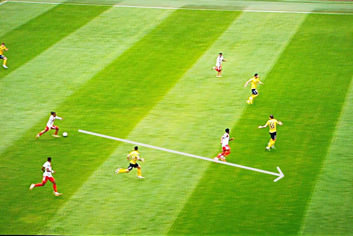 Следующий момент: длинная передача Осипенко на Мохеби. Рябчук и Литвинов задерживаются, из-за чего не получается создать положение «вне игры», а Денисов, как обычно, не понятно кого закрывает. (Фото 11)