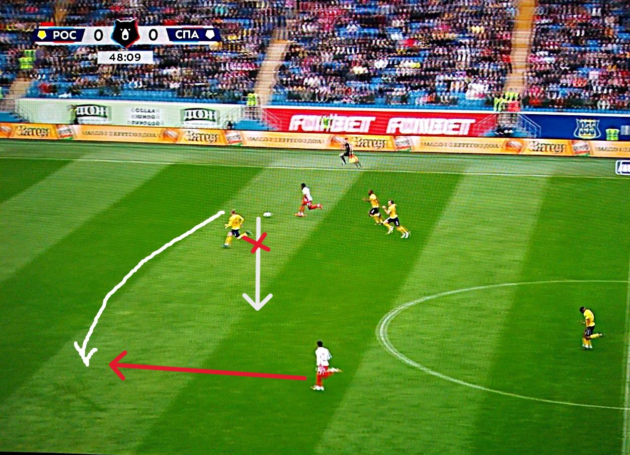 Теперь перейдем непосредственно к игре. В первом тайме «Спартак» владел небольшим преимуществом, но как-то воплотить его в цифры на табло не получалось. Хотя голевые моменты для этого были: тот же Маркиньос обязан был забивать после сольного прохода Барко и великолепной передачи, но, к сожалению, не вышло. Бонгонда хорошо выходил на оперативный простор, но вместо паса сначала на Гарсию (Фото 1), а потом на Мартинса (Фото 2), предпочёл пробить сам.