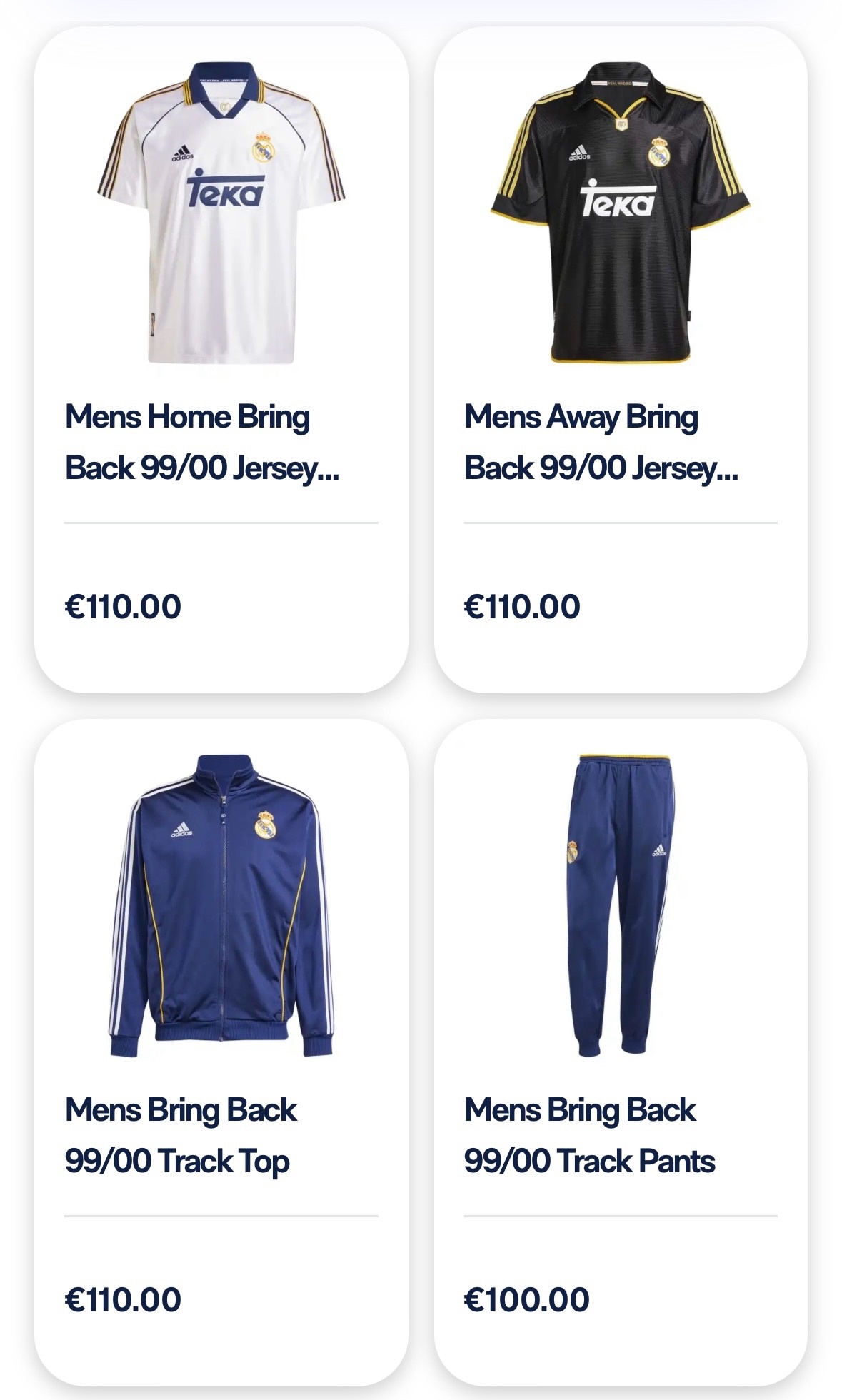Совместно с adidas «Мадрид» перевыпустил экипировку команды сезона-1999/2000: болельщики смогут приобрести домашнюю и выездную футболку, а также предматчевый костюм.