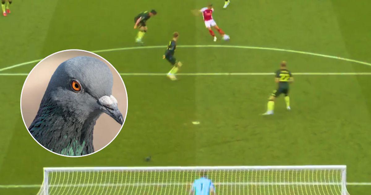 Птица расположилась прямо у линии вратарской, и мяч прошел в опасной близости от нее. Голубь чудом избежал встречи с мячом, а затем Марк Флеккен парировал удар.
