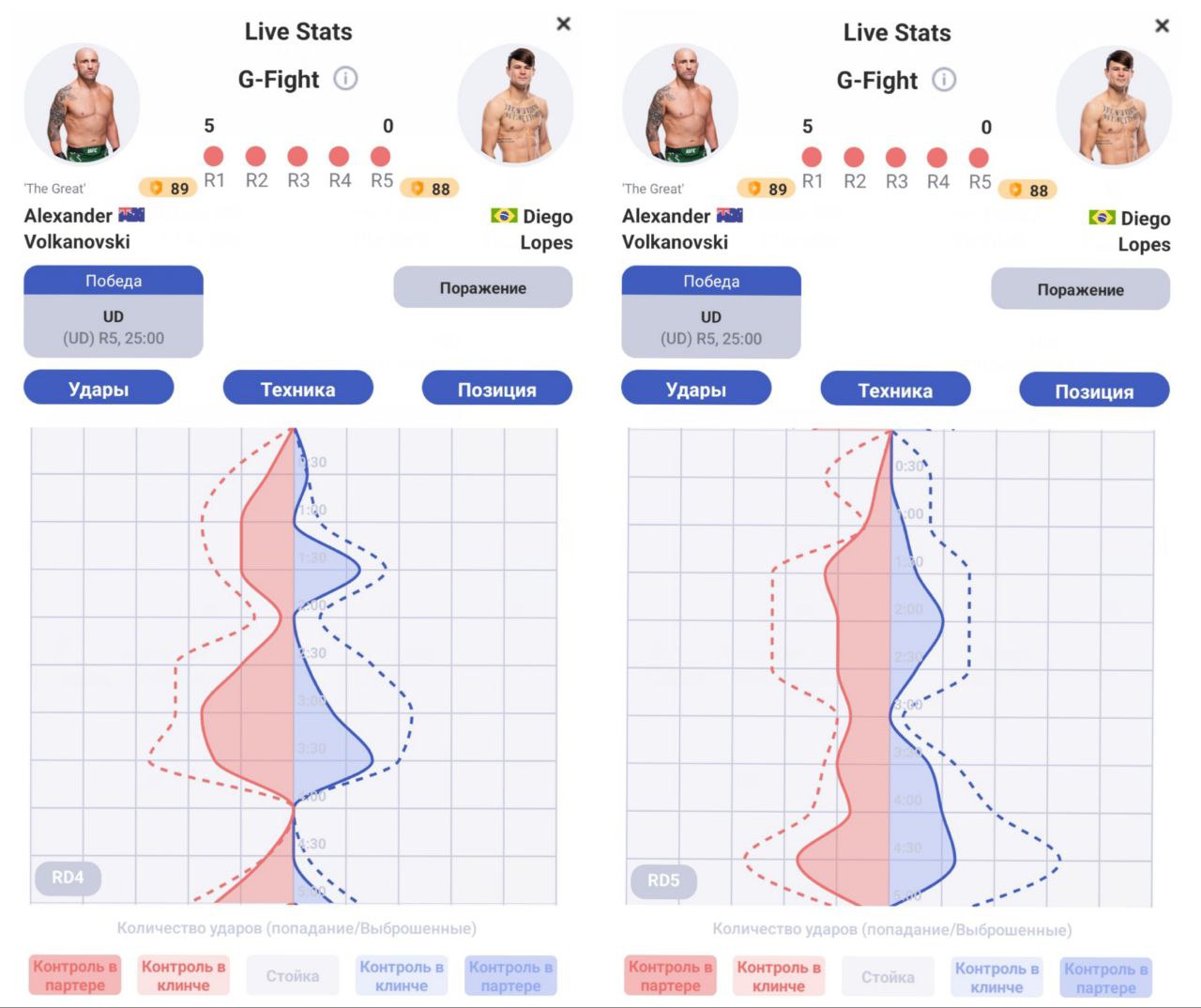 Четвертый и пятый раунды проходят примерно в схожем ключе. Лопес старается работать из центра октагона и выманивает Алекса на размен. Но ветеран действует очень грамотно: он здорово использует джебы, постоянно двигается и взрывается резкими атаками на сближении. Да, Диего пару раз достал своими размашистыми атаками. Но не более того. Волк был снова акцентированнее в своих наступлениях. Динамика поединка, отображенная в приложении Stats Fight, отлично показывает, что с точки зрения объема атакующих действий в чемпионских раундах Алекс преуспел больше.