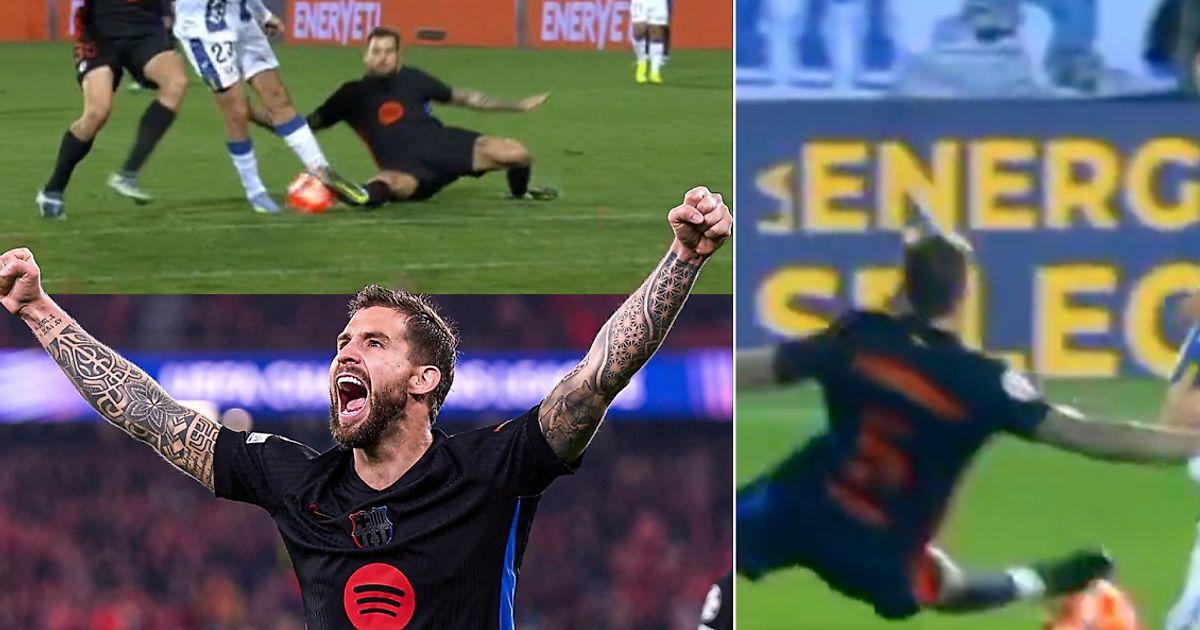 Центральный защитник «Барсы» исполнил идеальный подкат. Вот он с разных ракурсов.