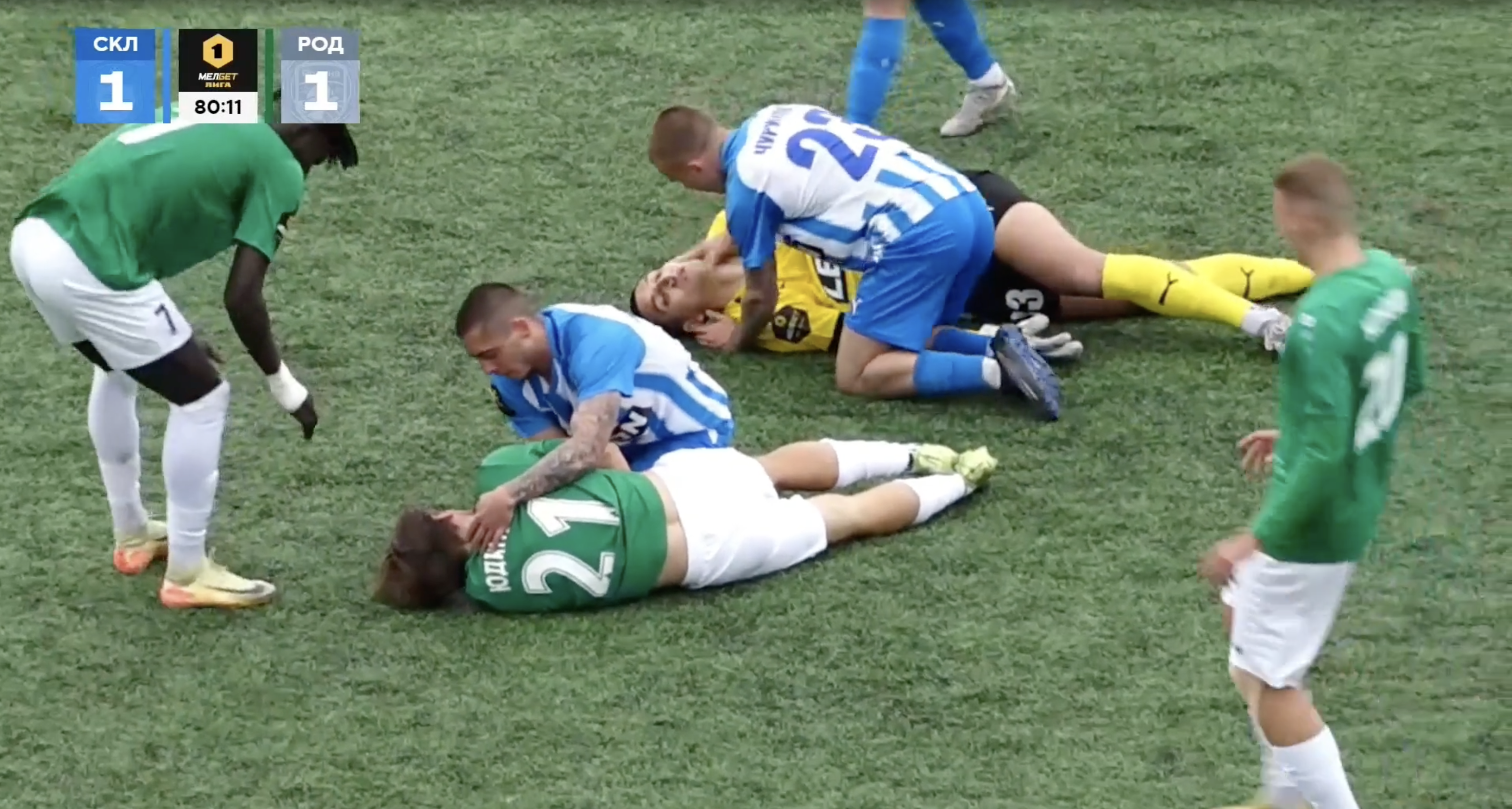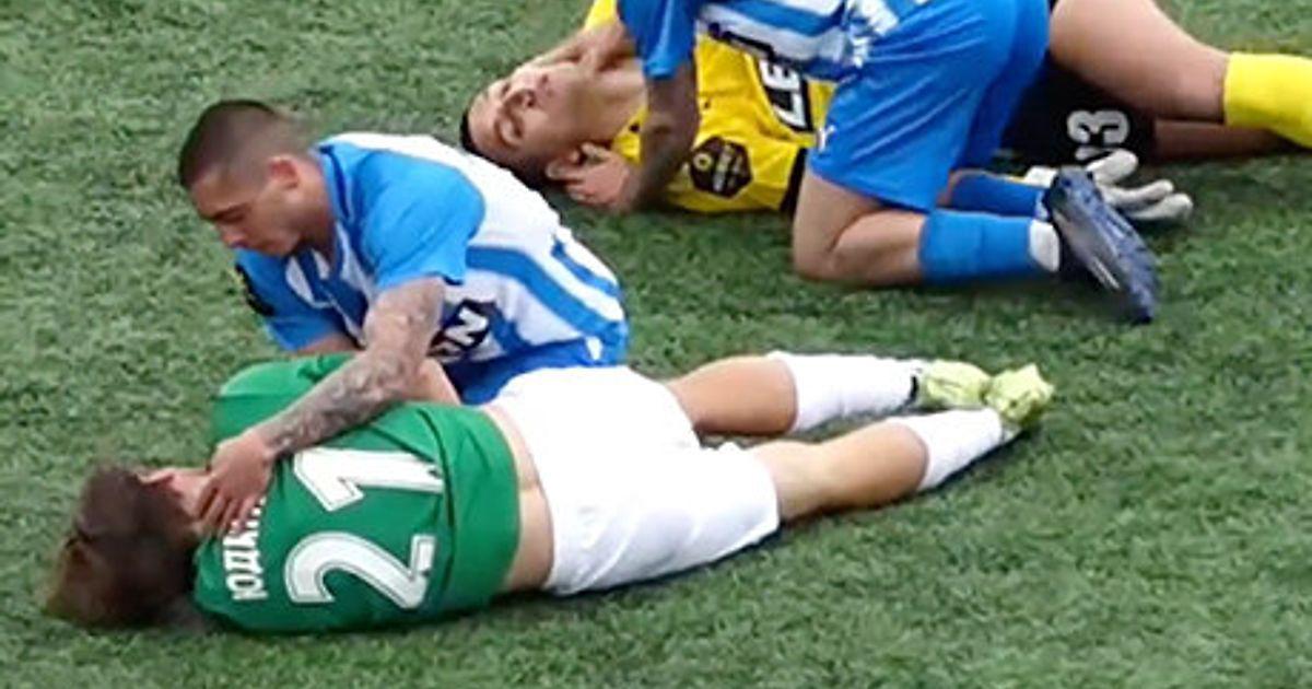 Все произошло в концовке игры. Вратарь «Сокола» Никита Карабашев вышел из своей штрафной, чтобы выбить мяч, полузащитник «Родины» Георгий Юдинцев побежал на перехват. А потом оба рухнули на газон без сознания.