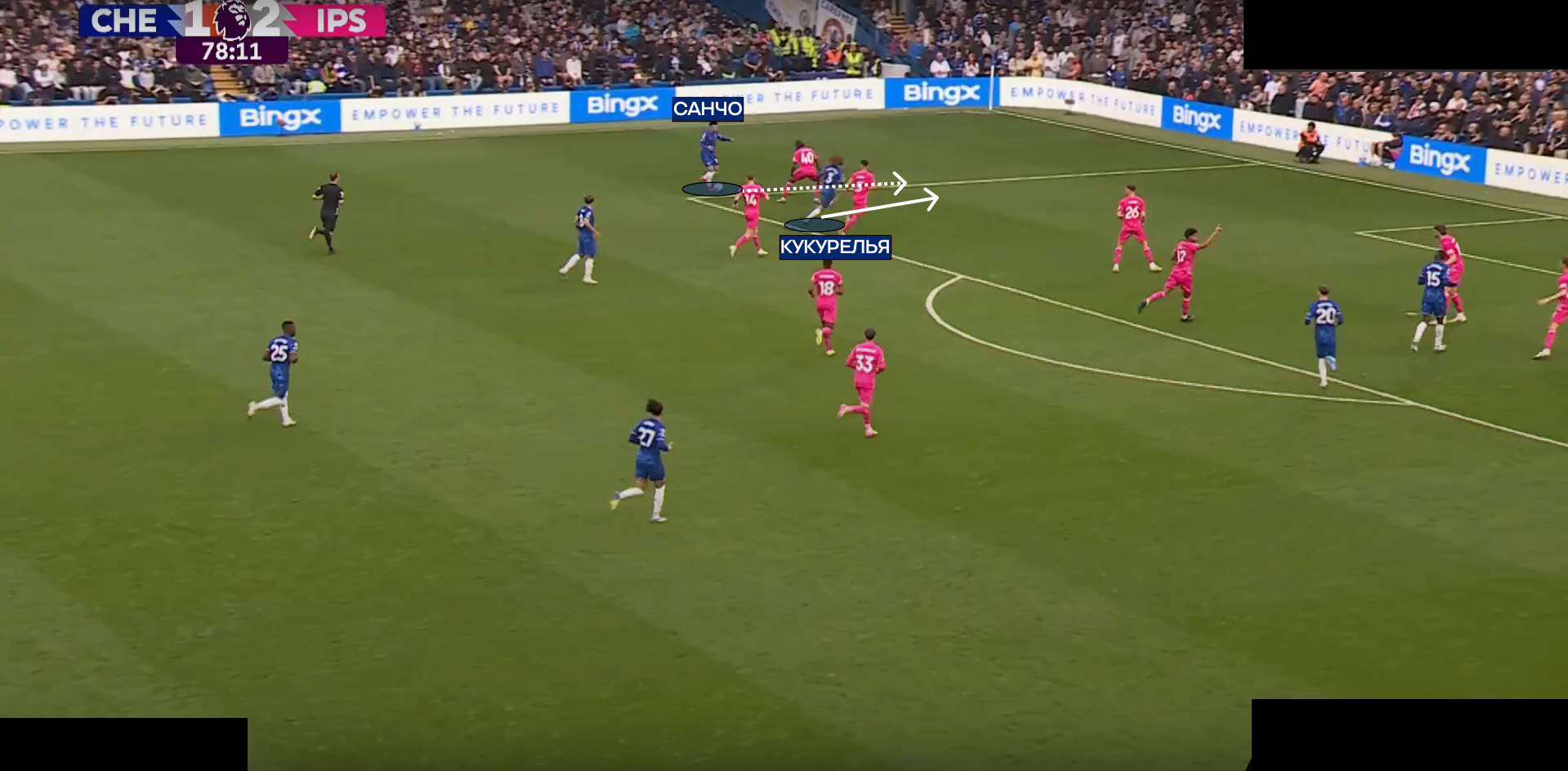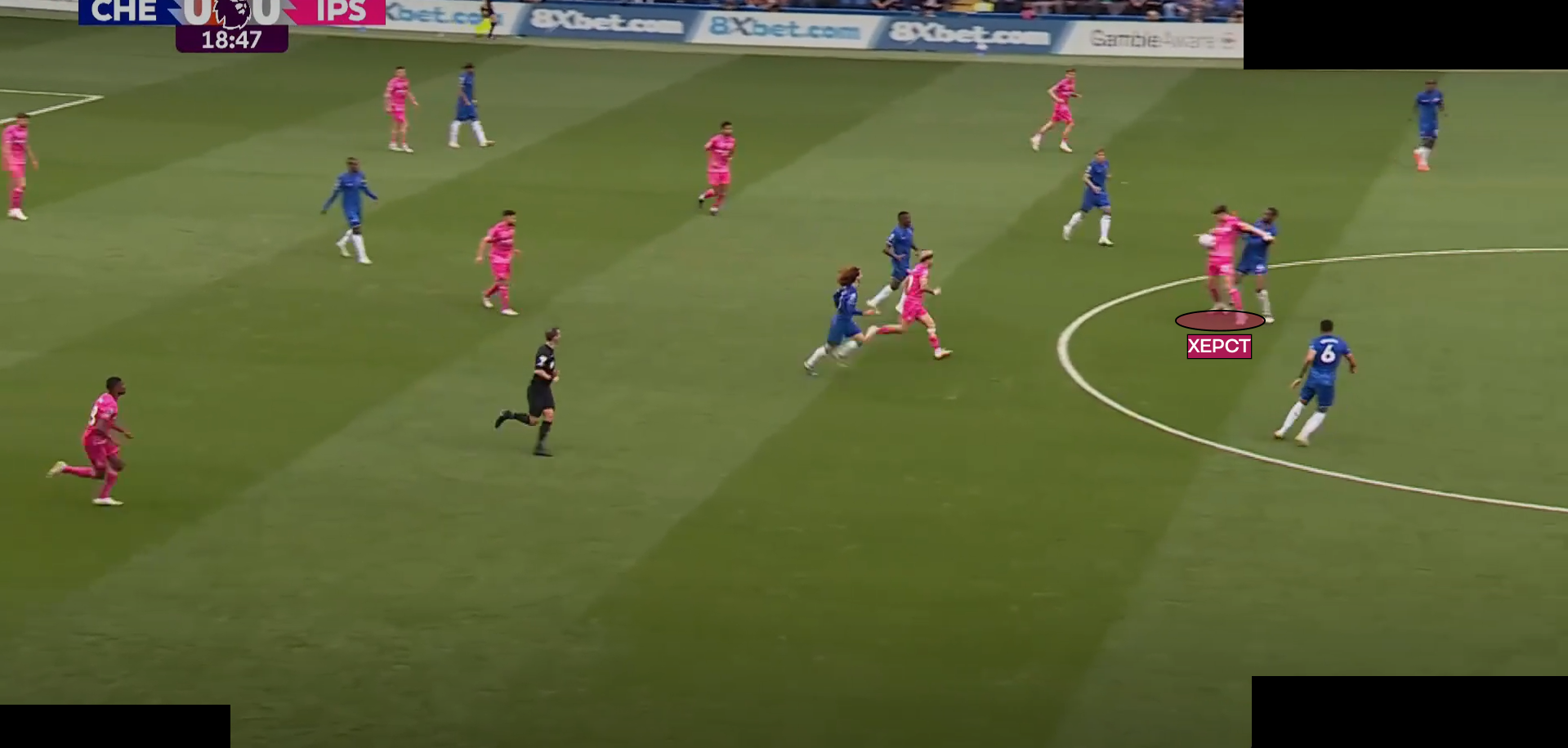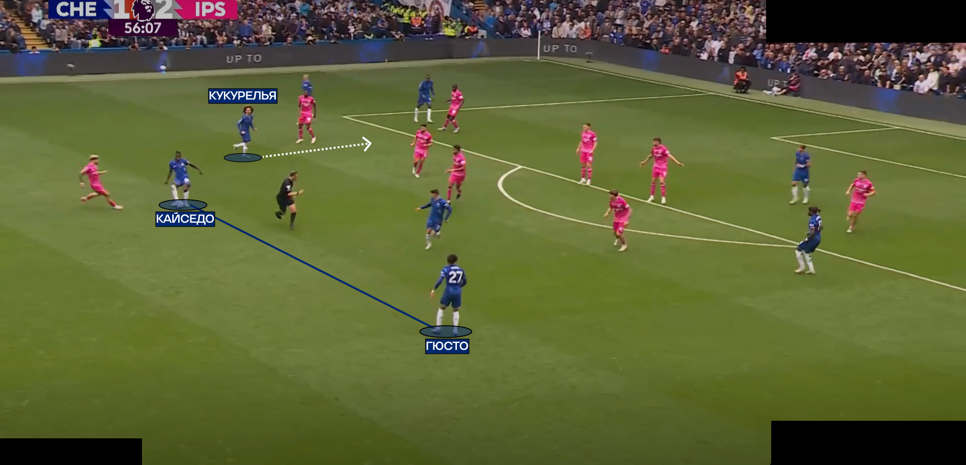 К такому ходу располагал и «Ипсвич», окончательно встав в низкий компактный блок без какого-либо желания прессинговать. В таких матчах крайне важна игра вингеров в ситуация «1 в 1». Пространства мало, поэтому на первый план могут выйти индивидуальные действия игроков. Во многом, в начале второго тайма «синие» забьют благодаря двум футболистам – Мадуэке и Кукурелье. Нони удачно прокинет мяч от Берджесса и прострелит в штрафную, а Марк сместится со своего полуфланга на правый, численно перегружая зону, куда должен прийти мяч. В такой ситуации любой отскок может стать результативным.