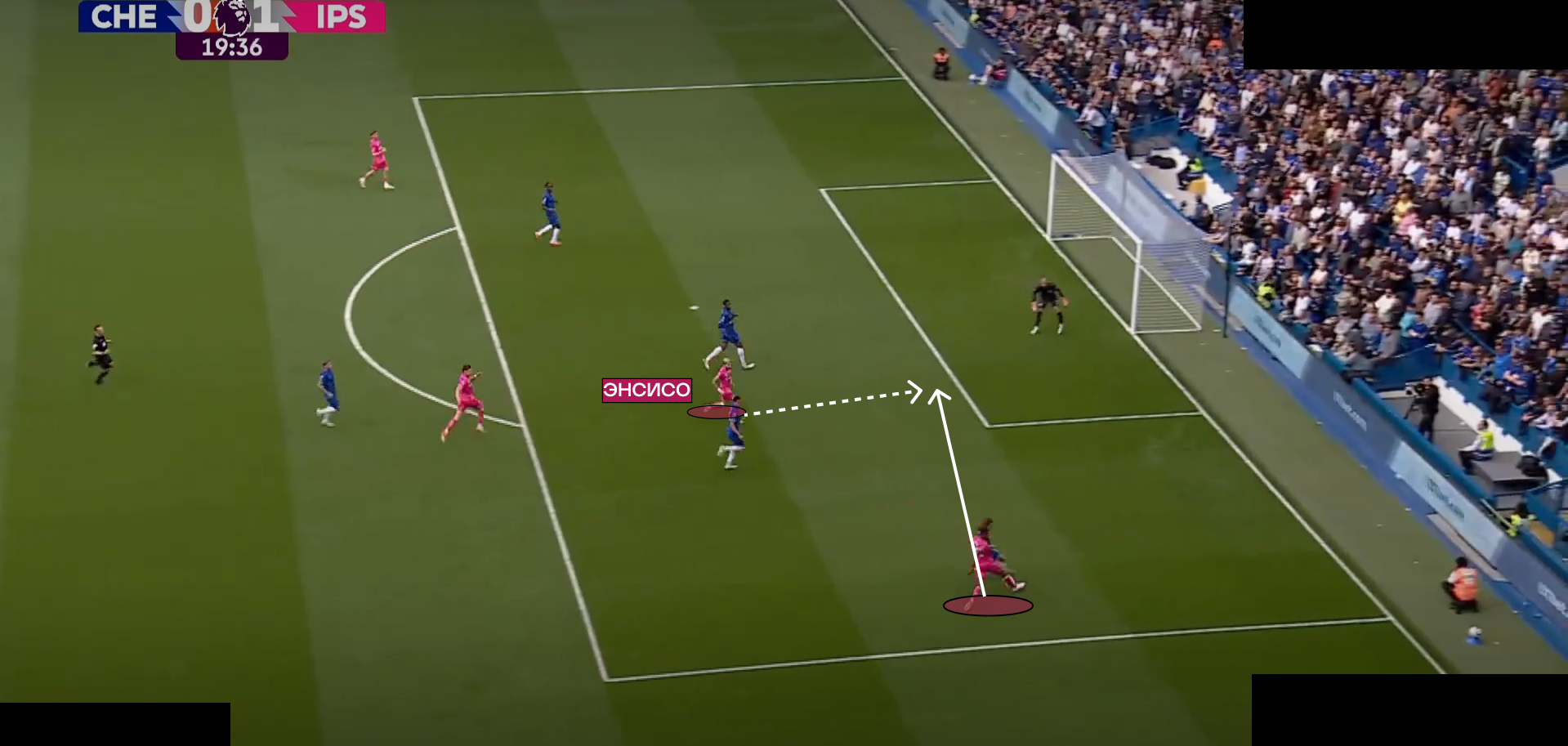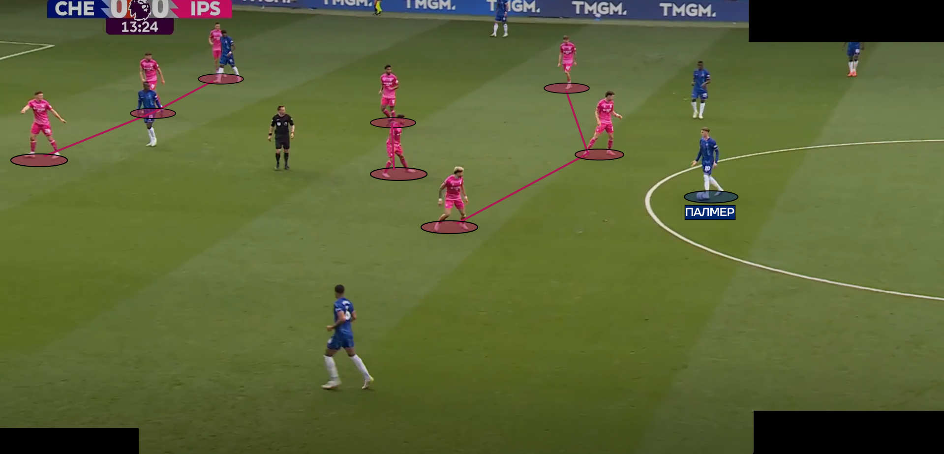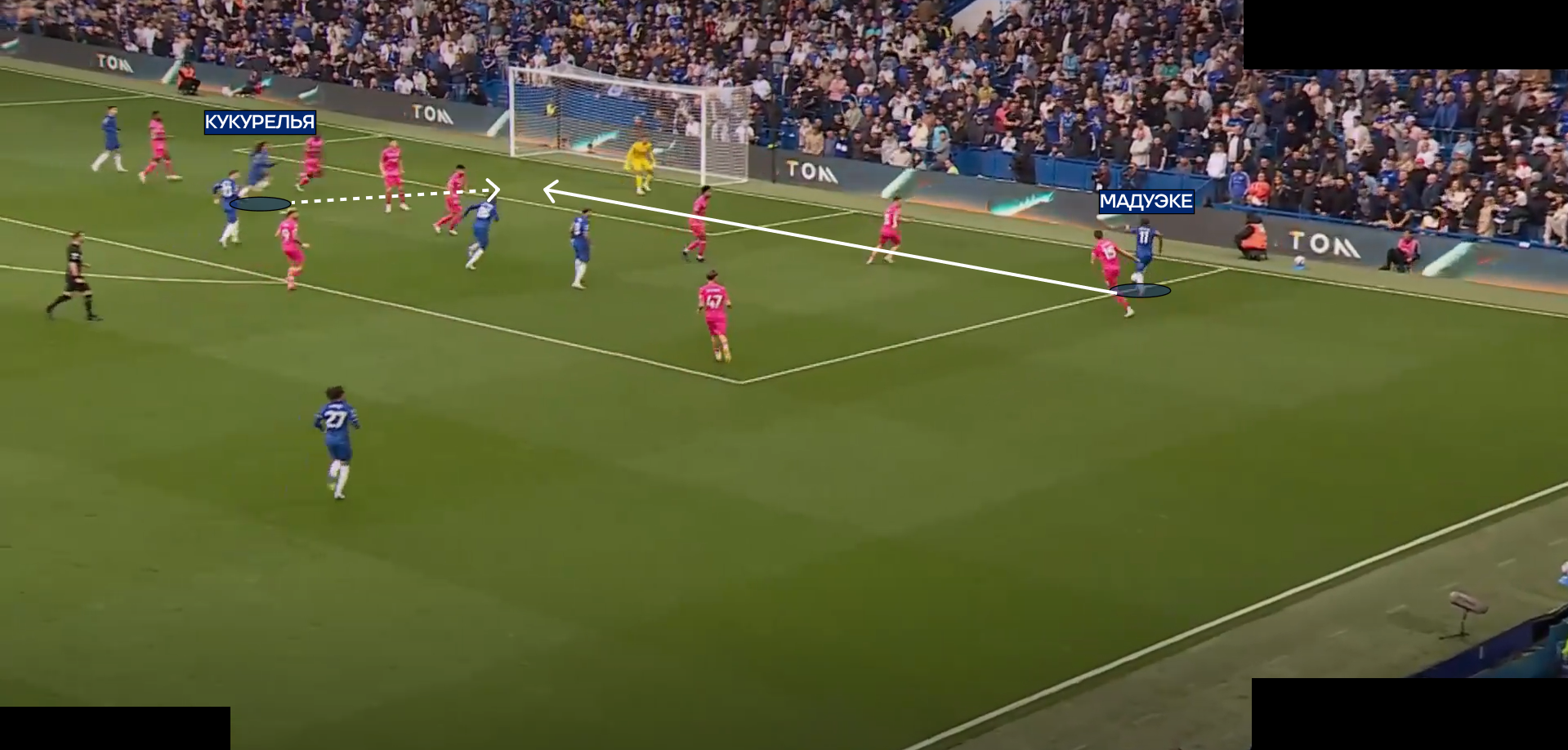 К такому ходу располагал и «Ипсвич», окончательно встав в низкий компактный блок без какого-либо желания прессинговать. В таких матчах крайне важна игра вингеров в ситуация «1 в 1». Пространства мало, поэтому на первый план могут выйти индивидуальные действия игроков. Во многом, в начале второго тайма «синие» забьют благодаря двум футболистам – Мадуэке и Кукурелье. Нони удачно прокинет мяч от Берджесса и прострелит в штрафную, а Марк сместится со своего полуфланга на правый, численно перегружая зону, куда должен прийти мяч. В такой ситуации любой отскок может стать результативным.
