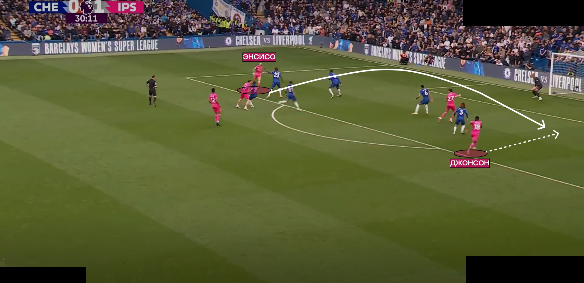 Далее, Херст без проблем проходит пустой центр поля «синих» (Энцо находится на другом фланге, а Кайседо по-прежнему разводит руками), и отдает пас на Джонсона.