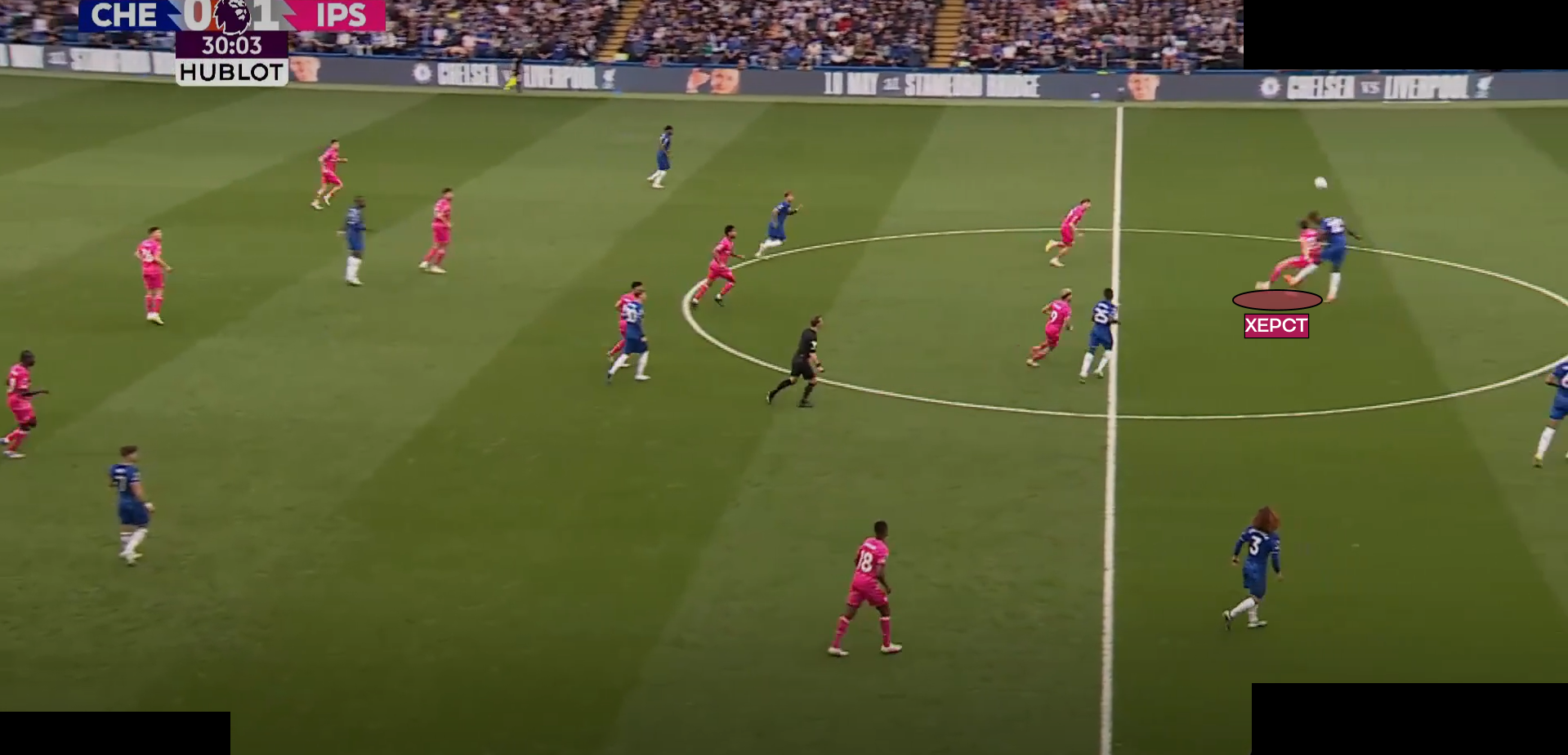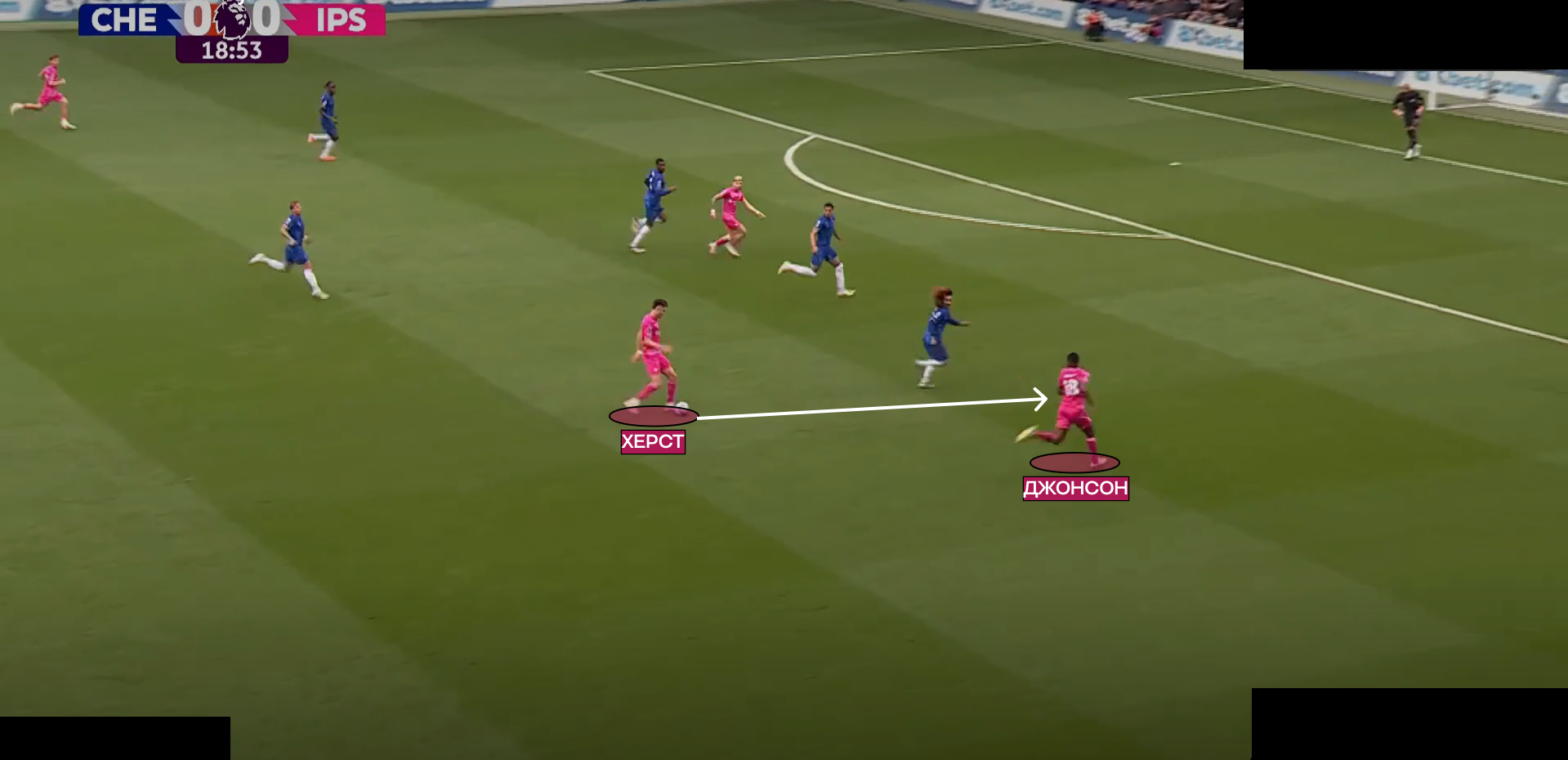 Вторая голевая атака «Ипсвича» имеет схожие моменты с первой. Все также начинается с выноса, только теперь от Санчеса. За верховой мяч цепляется Херст, снова выигрывая борьбу у защитника «Челси» (на сей раз у Трево Чалоба).