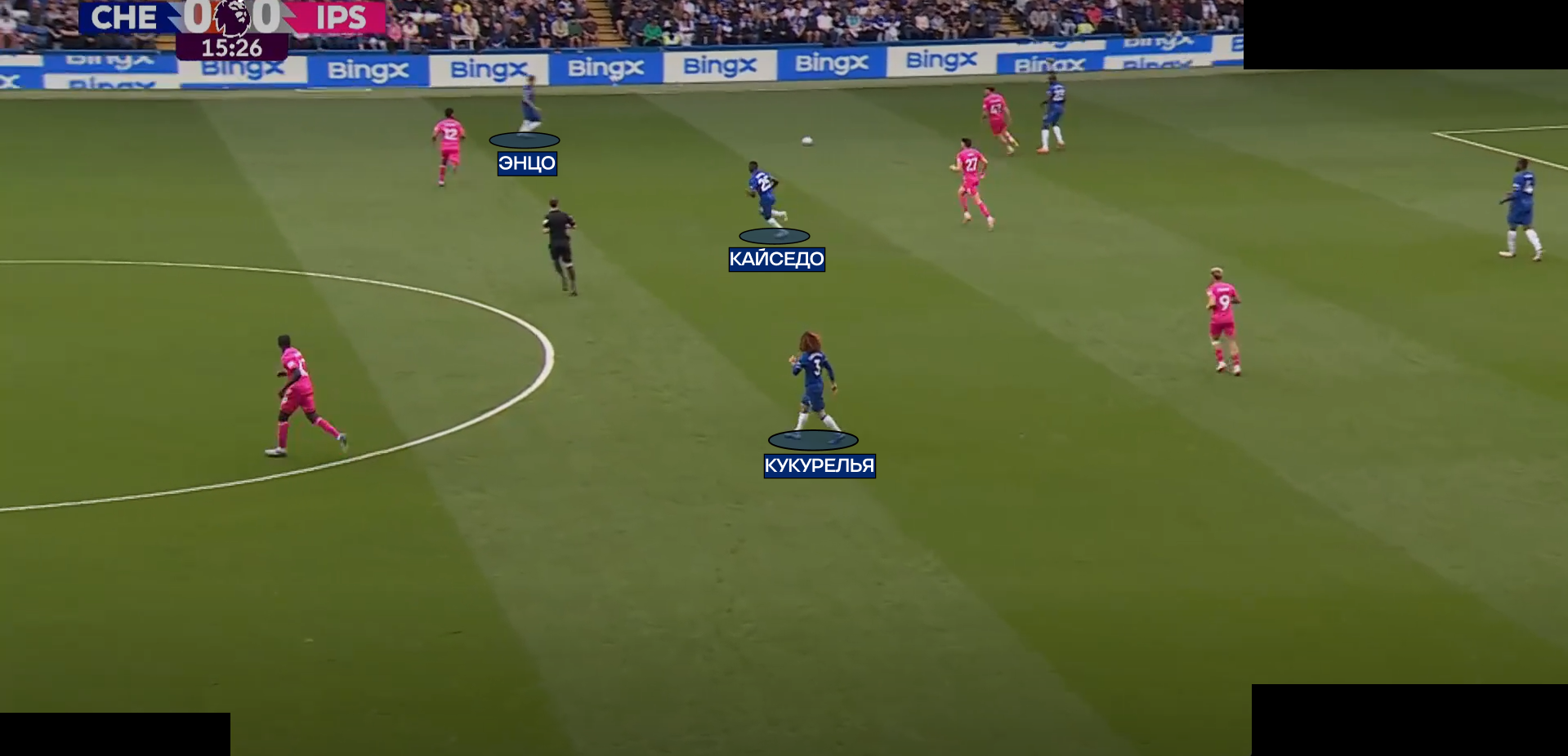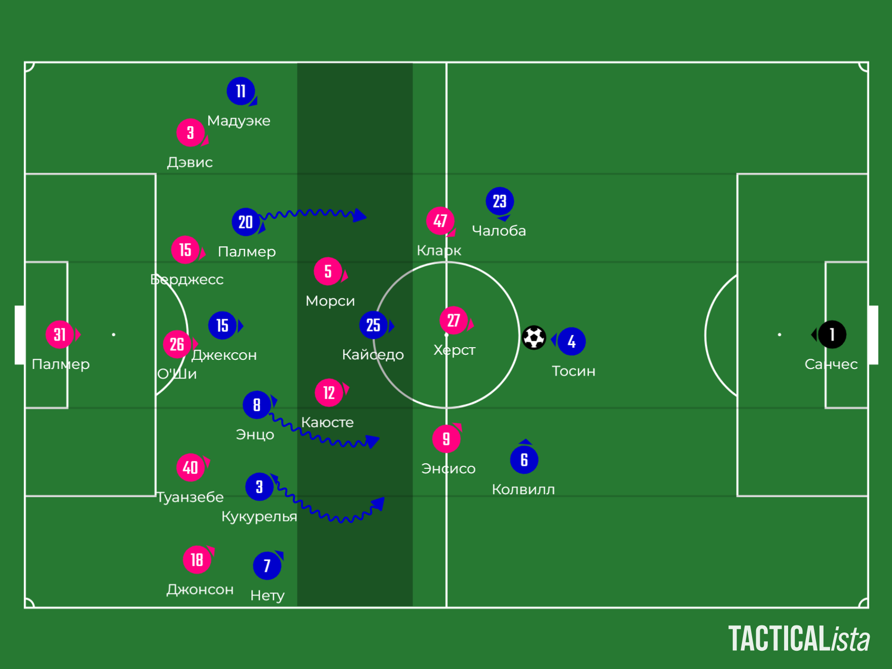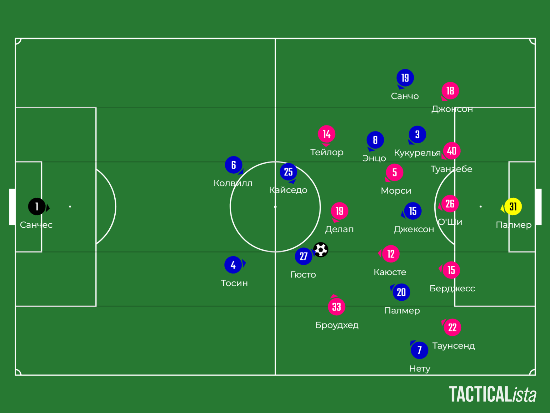 На эту защиту «Челси» ответил довольно смелым позиционным планом, оставив лишь одного Кайседо в опорной зоне. На помощь к эквадорцу ситуативно могли опускаться Кукурелья, Палмер или Энцо.