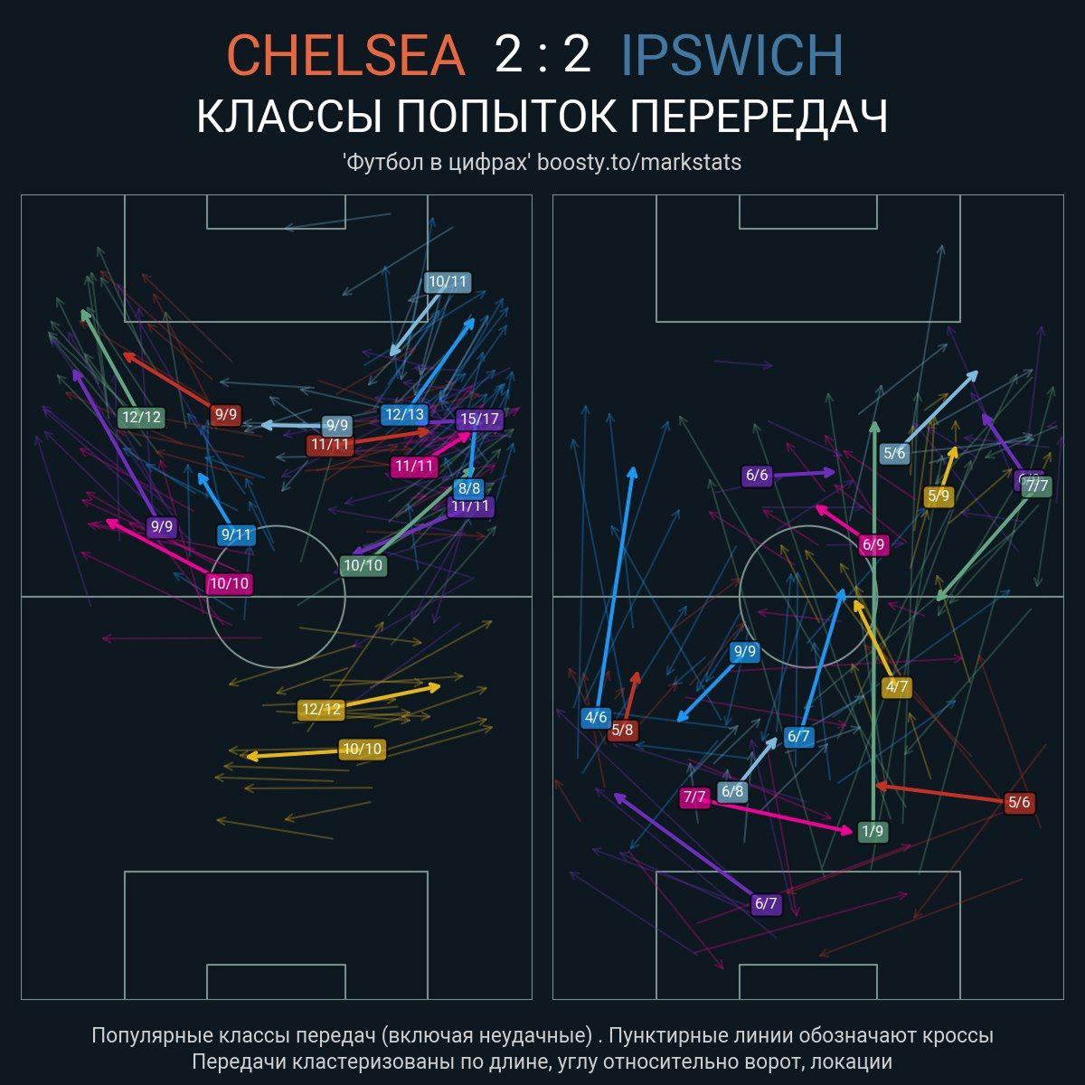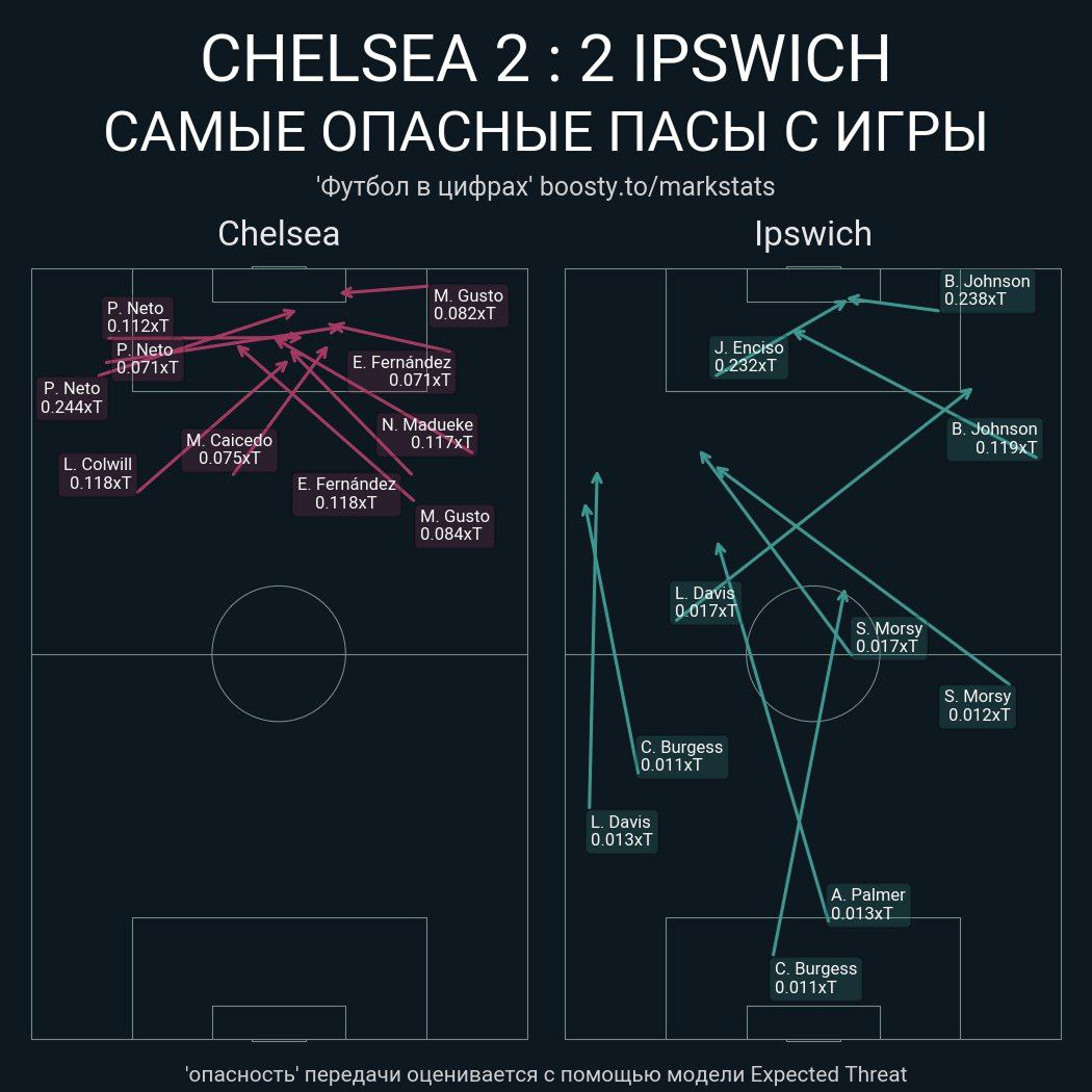 Если обратиться ко второму графику, показывающему самые опасные передачи с игры, то длинные пасы от «Ипсвича» обретают смысл – команде получалось выигрывать борьбу на земле и в воздухе, таким образом продвигая атаки.