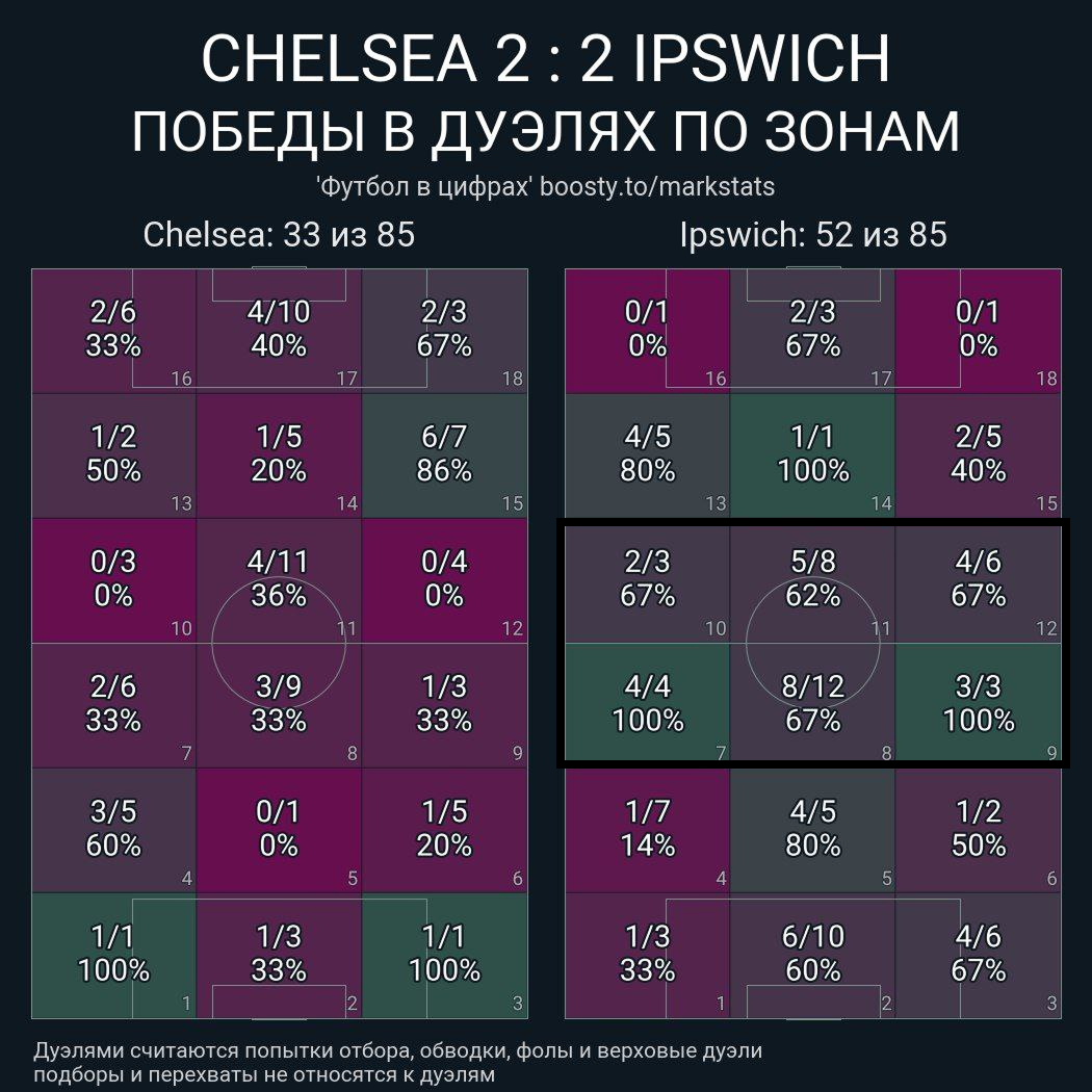 Эти два гола натолкнули меня посмотреть процент выигранных единоборств у «Челси» по зонам. Результат, конечно, удручающий – команда Марески проиграла больше половины борьбы за мяч. Больше поражают показатели в центре поля, где «Ипсвич» выиграл более 60% дуэлей в каждой из 6 зон.