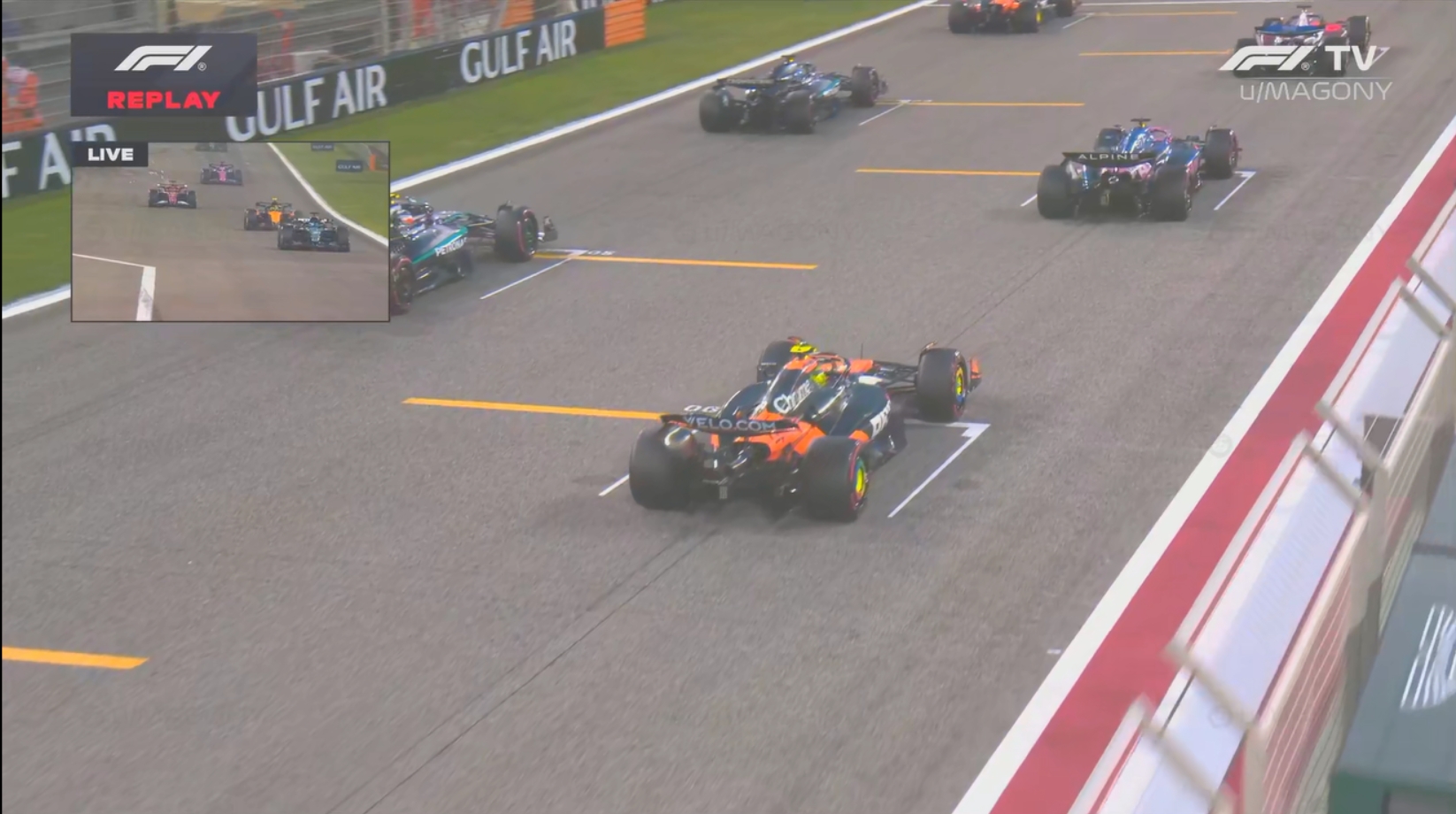 А еще умудрился накосячить еще до старта гонки. После прогревочного круга пилоты выстроились на решетке, но Ландо чуть раньше отпустил сцепление и выкатился за пределы белой линии. На скриншоте видно, как его колеса находятся за белой чертой, тогда как у остальных до.