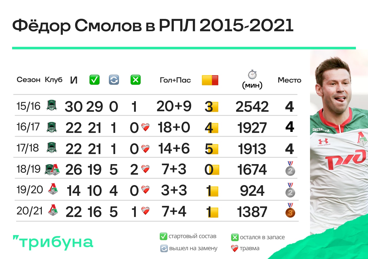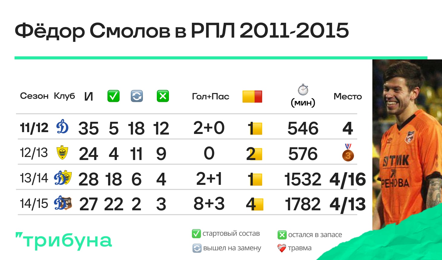 Парадокс, но именно в эти, пожалуй, самые непростые годы, Смолов завоевал свои первые медали и был максимально близок к первому месту. Следующие серьезные попытки стать чемпионом придутся уже на вторую половину 2010-х годов. К этому времени Федор сможет совершить ребут и стать несколько раз футболистом года, отыграть на Евро-2016 и подойти перед домашним чемпионатом мира в статусе главной отечественной футбольной звезды.
