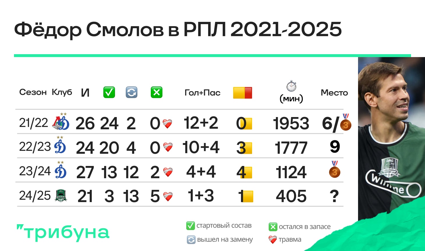 К сожалению, личные успехи не становились командными. «Краснодар» не поднимался все эти годы выше четвертого места и, после проваленного Смоловым домашнего мундиаля, продаст своего капитана за 9 миллионов евро в чемпионский «Локомотив».