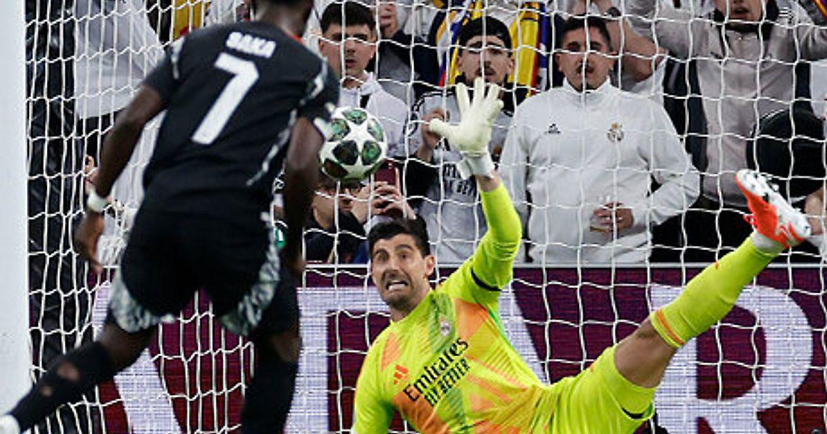 Сака взял небольшой разбег, смотрел на Тибо Куртуа. Он очень долго ждал после свистка, судья даже торопил.