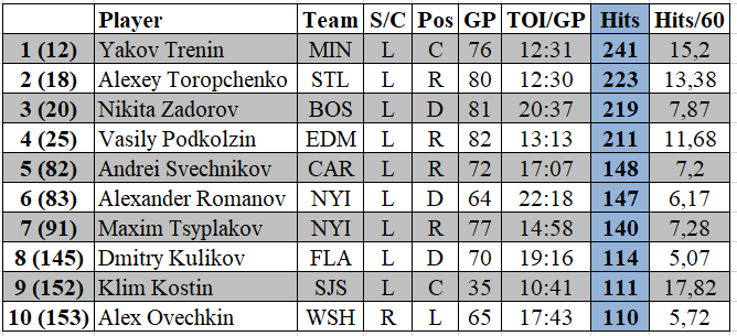 Далее расположился Василий Подколзин (211 хитов в 82 матчах). Подколзин стал первым по этому показателю в «Эдмонтоне» в этом сезоне, он опередил Дарнелла Нерса на 50 силовых приемов (211 против 161).