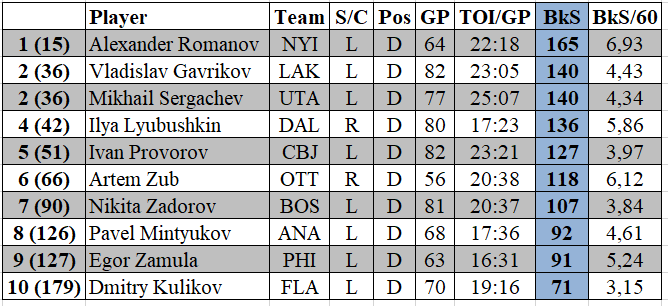 По показателю заблокированные броски на 60 минут игры, среди наших игроков, сыгравших 30 и более матчей, пятерка лучших выглядит следующим образом: 1) Александр Романов 6.93 (64 матча, среднее время на льду 22:18); 2) Артем Зуб 6.12 (56, 20:38); 3) Илья Любушкин 5.86 (80, 5.86); 4) Шакир Мухамадуллин 5.64 (30, 18:04); 5) Егор Замула 5.24 (63, 16:31).