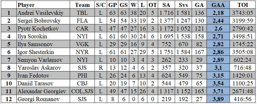 Среди вратарей, сыгравших 50 и более матчей, пятерка лучших вратарей выглядит следующим образом: 1) Коннор Хеллебайк («Виннипег») 2.00 (63 матча); 2) Дарси Кемпер («Лос-Анджелес») 2.02 (50); 3) Андрей Василевский («Тампа-Бей») 2.18 (63); 4) Сергей Бобровский («Флорида») 2.47 (54); 5) Эдин Хилл («Вегас») 2.47 (50).
