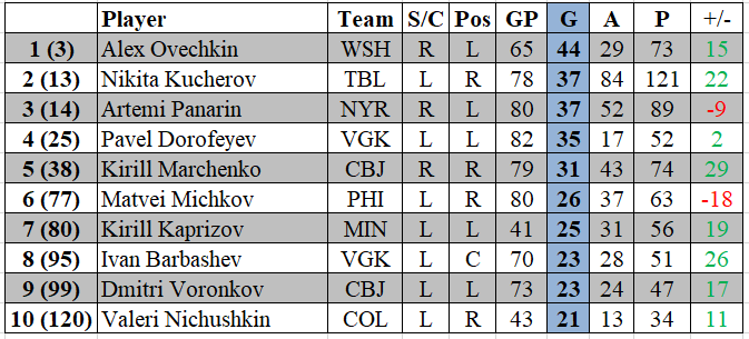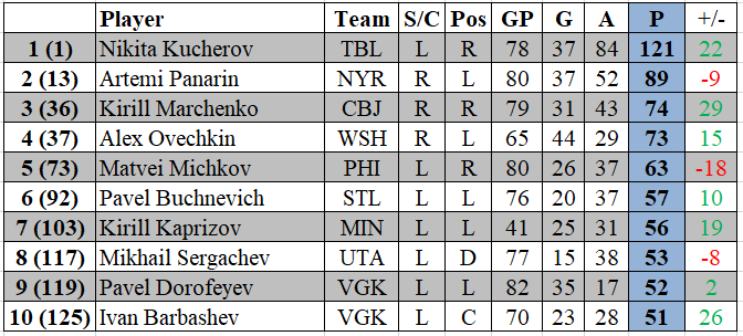 По сравнению с прошлым сезоном количество наших игроков в топ-50 стало больше на одного. В сезоне 2023/24 3 игрока вошли в 50 лучших: 1) Никита Кучеров (144 (44+100) очка в 81 матче); 4) Артемий Панарин (120 (49+71) очков в 82 играх); 11) Кирилл Капризов (96 (46+50) очков в 75 матчах).