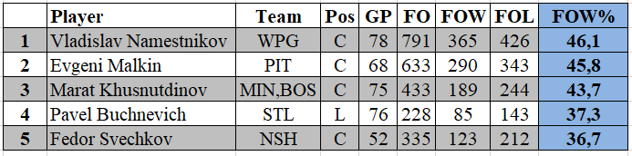 Среди тех, кто регулярно вставал на точку вбрасывания лучшим по проценту стал Владислав Наместников, который выиграл 46.1% выбрасываний. Вторым стал форвард «Питтсбурга» Евгений Малкин, который выиграл 290 из 633 вбрасываний (45.8%). Третью строчку забрал Марат Хуснутдинов, который также имел процент выше 40 (43.7%).