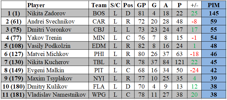 Худшие по показателю полезности среди россиян: Евгений Малкин «-24» (68 матчей, среднее время на льду 17:47); Матвей Мичков «-18» (80, 16:41); Федор Свечков «-17» (52, 12:53); Егор Замула «-14» (63, 16:31); Владимир Тарасенко «-13» (80, 14:47); Марат Хуснутдинов «-11» (75, 12:05); Артемий Панарин «-9» (80, 19:41); Михаил Сергачев «-8» (77, 25:07); Андрей Свечников «-8» (72, 17:07).