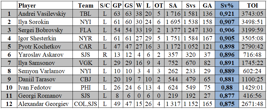 В прошлом сезоне сыграло 13 вратарей и только у 4-х процент был ниже 90%. 9 вратарей имели процент выше 90%. А лучшим в прошлом сезоне по проценту отраженных бросков, среди игроков сыгравших хотя бы 20 матчей, стал Семен Варламов с 91.8%.