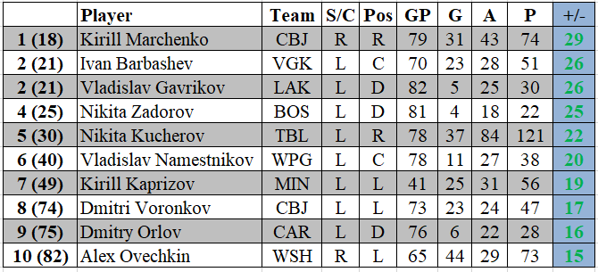7 российских игроков закончили регулярный сезон в топ-50 по показателю полезности. В прошлом сезоне только Александр Романов попал в 50 лучших, заработав «+23» за 81 матч (25 место по итогам прошлого сезона).