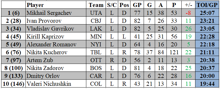 Список лидеров по игровому времени в НХЛ выглядит следующим образом: 1) Зак Веренски («Коламбус») среднее время на льду 26:45 (81 матч); 2) Куинн Хьюз («Ванкувер») 25:44 (68); 3) Кейл Макар («Колорадо») 25:43 (80); 4) Брок Фэбер («Миннесота») 25:32 (78); 5) Миро Хисканен («Даллас») 25:10 (50); 6) Михаил Сергачев («Юта») 25:07 (77); 7) Майк Матесон («Монреаль») 25:05 (80); 8) Мориц Зайдер («Детройт») 25:04 (82); 9) Роман Йоси («Нэшвилл») 25:02 (53); 10) Сет Джонс («Чикаго» / «Флорида») 24:38 (63).