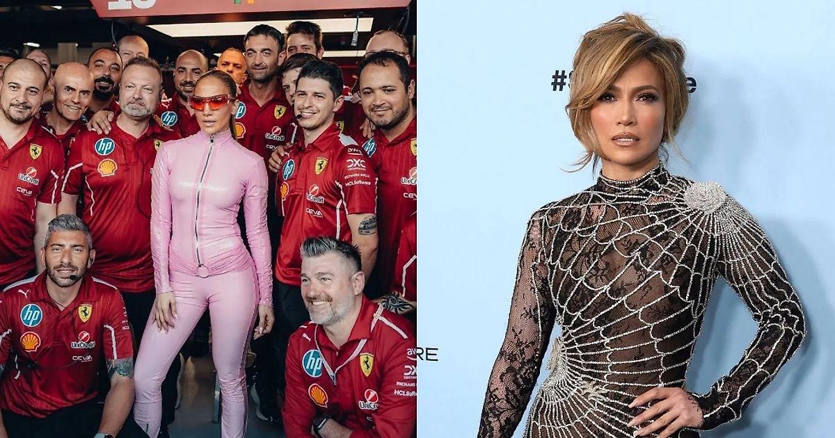 Дженнифер Лопес посетила Гран-при «Формулы-1» и сфоткалась с командой Феррари: в шикарном розовом комбинезоне 😍
