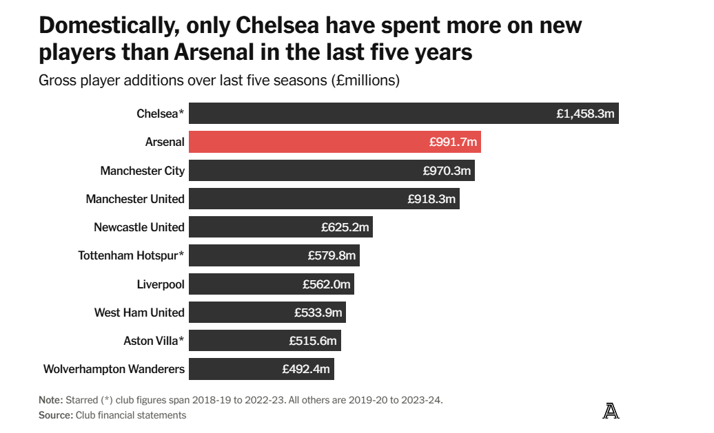 То есть траты «Арсенала» действительно велики, но они ещё и догоняют — компенсируют годы, когда другие тратили куда охотнее.