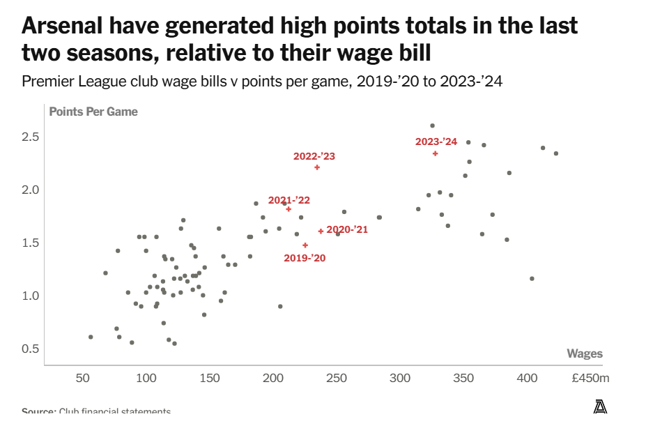 В последние два сезона «Арсенал» при Артете стабильно набирает высокие очки в таблице — и делает это, мягко говоря, не благодаря, а вопреки своей зарплатной ведомости. В сезоне 2022/23 они финишировали вторыми, имея лишь шестой по размеру фонд оплаты труда в Премьер-лиге. В прошлом году — снова второе место, но уже с пятым по уровню затрат на персонал.