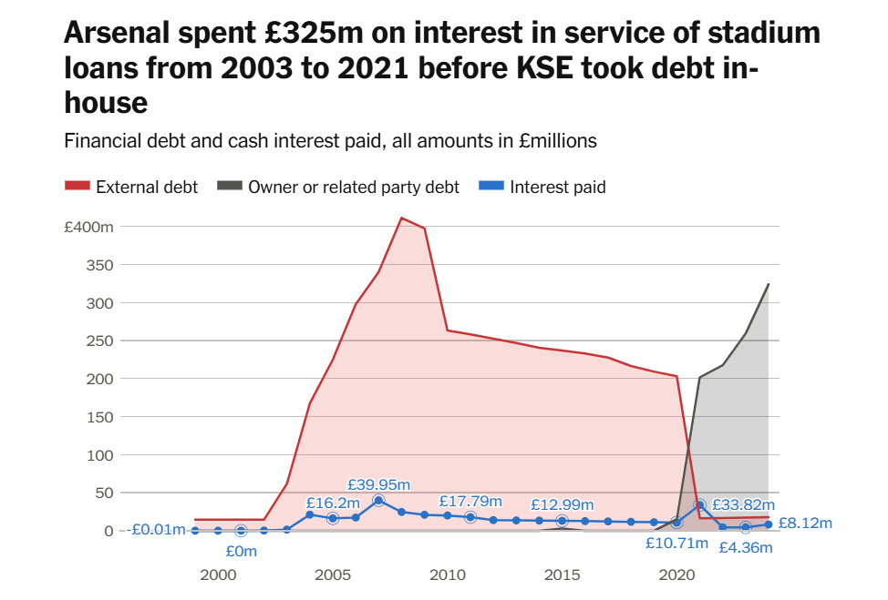 С 2003 по 2021 год «Арсенал» выплатил £325 млн только на проценты по займам, взятым ради строительства «Эмирейтс». Лишь в 2021 году, когда KSE взяли долги на себя, клуб освободился от этих внешних обязательств.