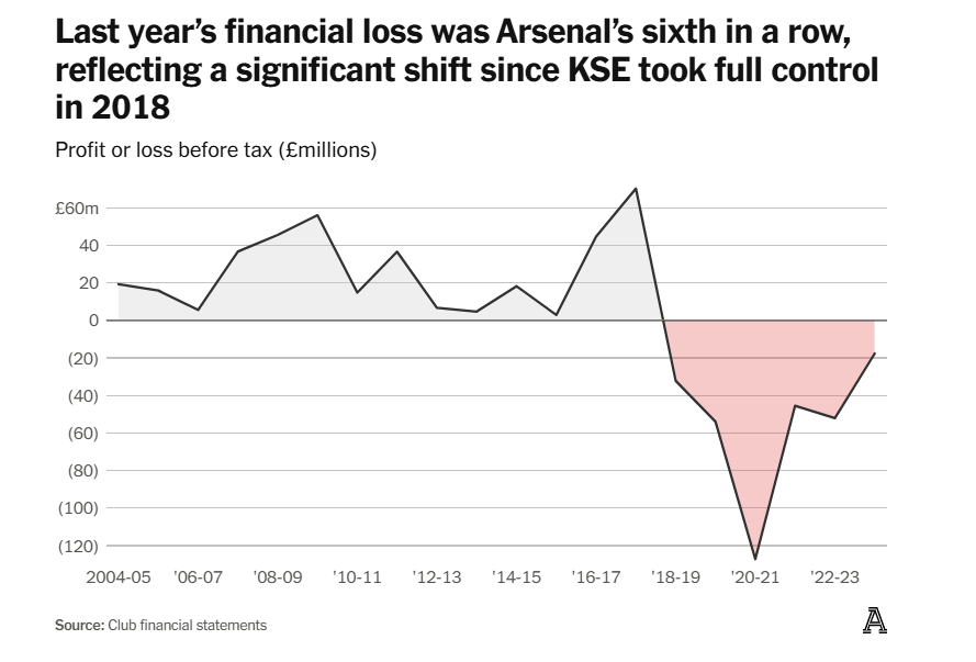 Клубы могут увеличивать допустимый лимит убытков по PSR до £105 млн за трёхлетний период, если владельцы обеспечивают так называемое «надёжное финансирование» — чаще всего через выпуск акций. Однако KSE в основном предоставляли клубу кредиты, которые под PSR не считаются таким финансированием. Исключением стало вложение в £5,4 млн в 2023 году — его признали «надёжным». В итоге лимит допустимого убытка для «Арсенала» за последние три года составил лишь £20,4 млн: базовые £15 млн плюс вышеуказанное вложение.