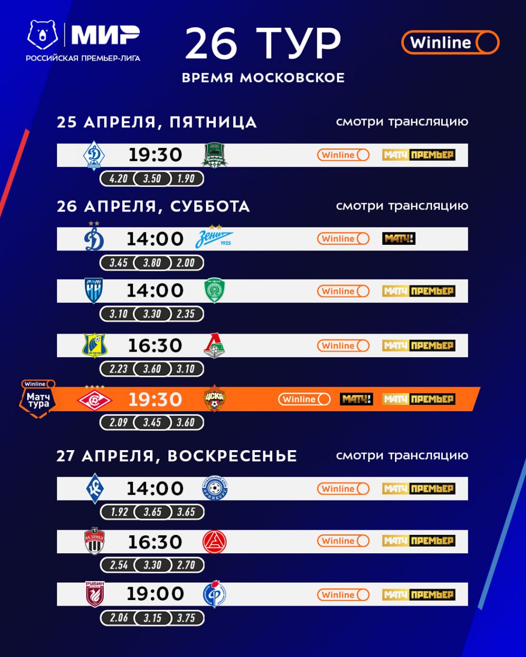 Открытием 26 тура станет матч в Каспийске на Анжи арене между Махачкалинским Динамо и Краснодаром.